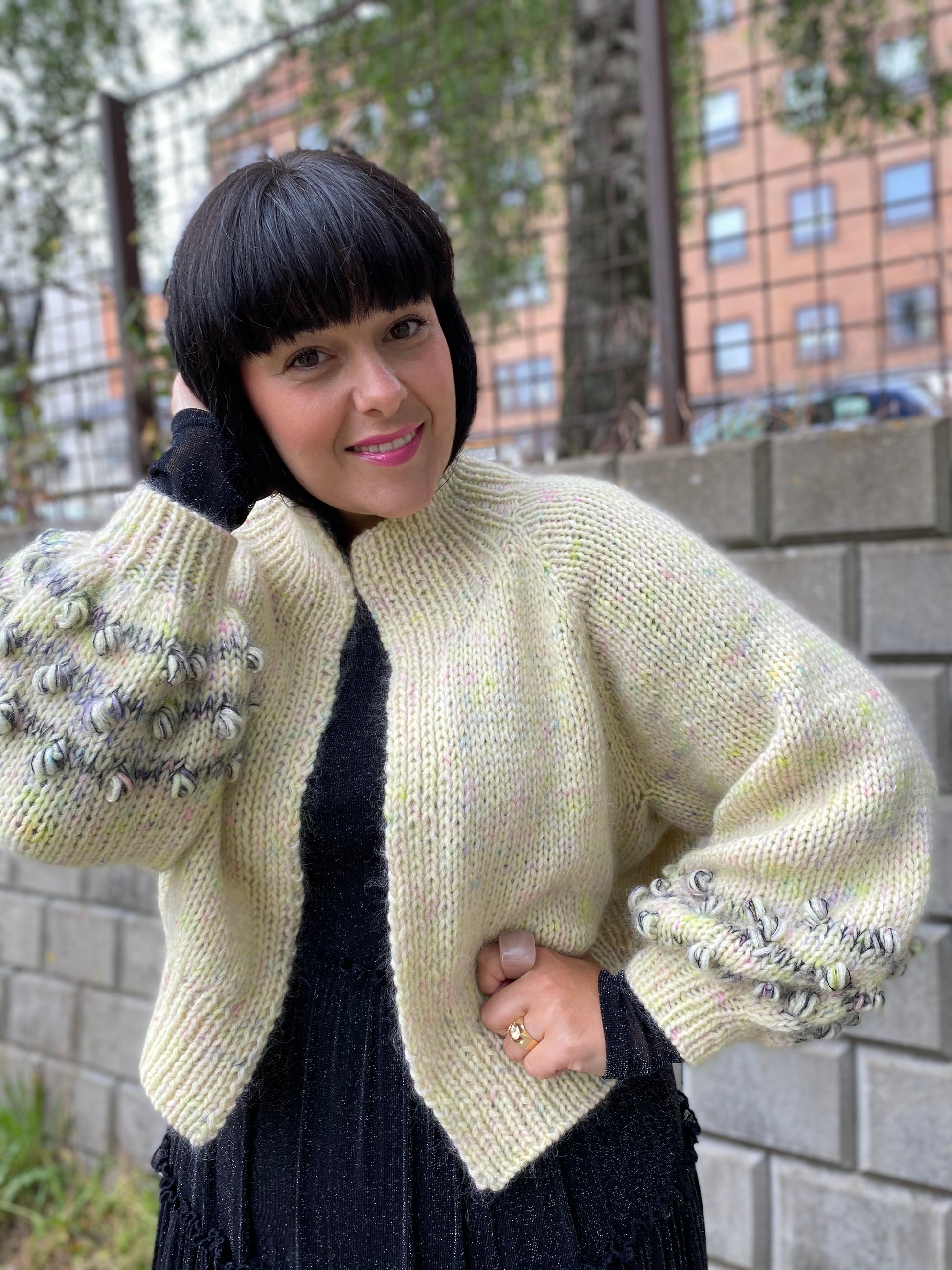 Candypop Cardigan er en chunky oversized og cropped model. Den har en høj krave, som du kan vælge at folde ned, eller forkorte om du ønsker det. Den har lange ballonærmer med popcorn og striber forneden. Den strikkes oppefra og ned, ved at lave raglanudtagninger undervejs. Cardiganens bærestykke og krop strikkes frem og tilbage, hvorimod ærmerne strikkes rundt.