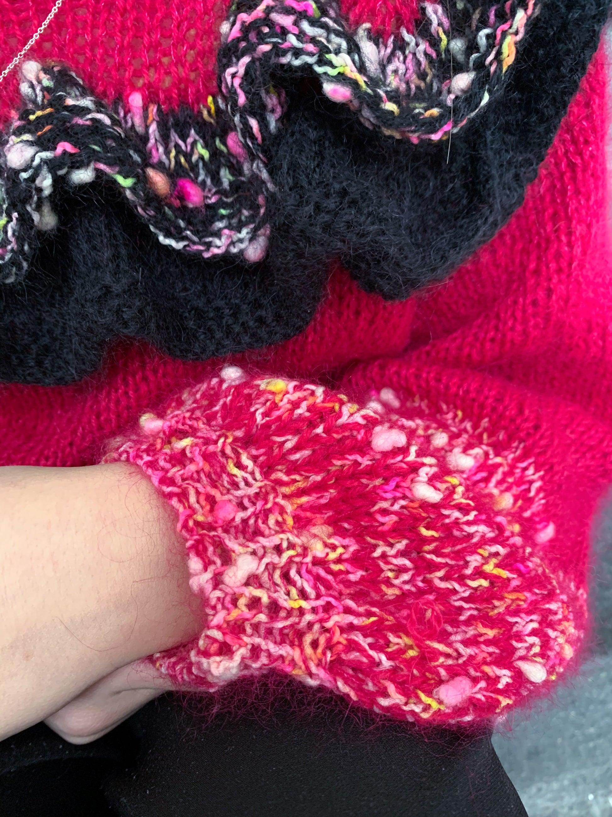 Dbl Frills sweater Junior, er en loose og cropped model, med 2 store overdådige flæser der går hele vejen rundt. Den strikkes oppefra og ned, og du kan selvfølgelig justere længden undervejs på både krop og ærmer. Flæserne strikker du først til sidst, men du strikker undervejs de vrangmasker, hvor du senere skal samle masker op til flæserne. Du kan selvfølgelig vælge kun at strikke én flæse, eller undlade dem helt. Du kan ligeledes lege med udtrykket på flæserne ved af bruge forskellige garntyper og farver. Jeg har valgt både at slå masker op og lukke af med italiensk aflukning, da det giver et enormt fint og elastisk finish. Jeg har ligeledes valgt at forhøje nakken for et bedre fit ved hjælp af vendepinde, og metoden German short rows. Samtidig med at nakken forhøjes, strikkes der udtagninger på både ret- og vrangsiden. Når alle udtagningerne er strikket, sættes ærmemaskerne på hold, imens resten af kroppen strikkes færdig. Ærmerne sættes til sidst tilbage på en rundpind og strikkes færdige hver for sig.