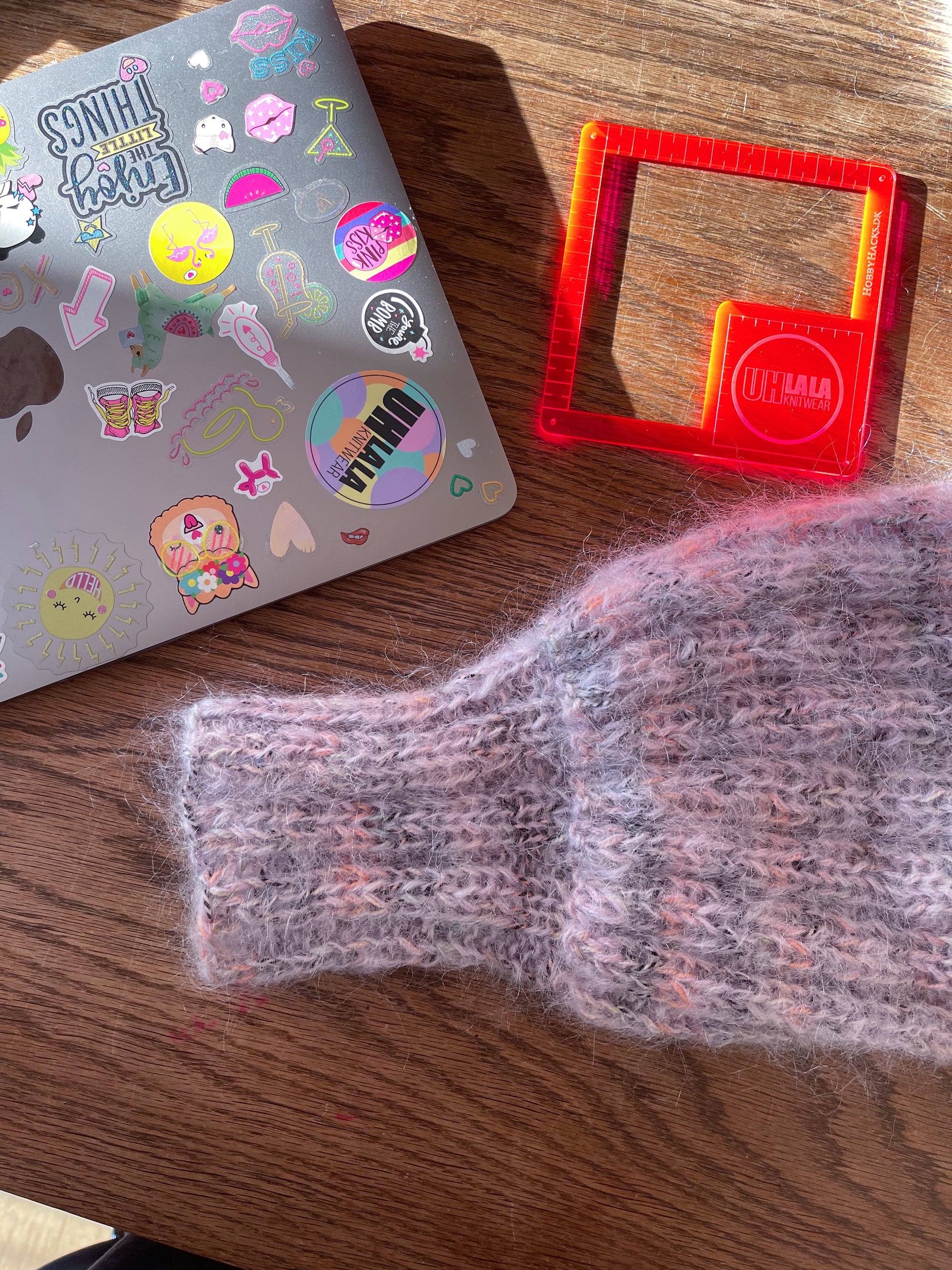 14 masker & 17 pinde = 10 x 10 cm i 2x2 rib på pind 7 mm med de 2 tråde holdt sammen