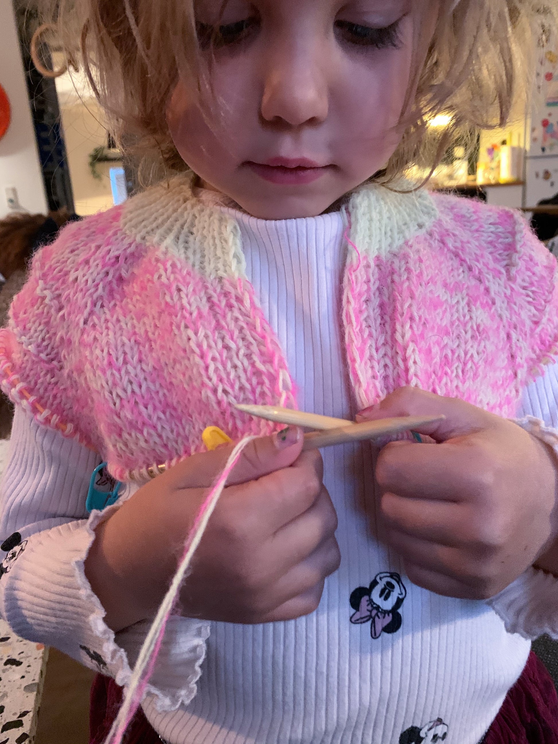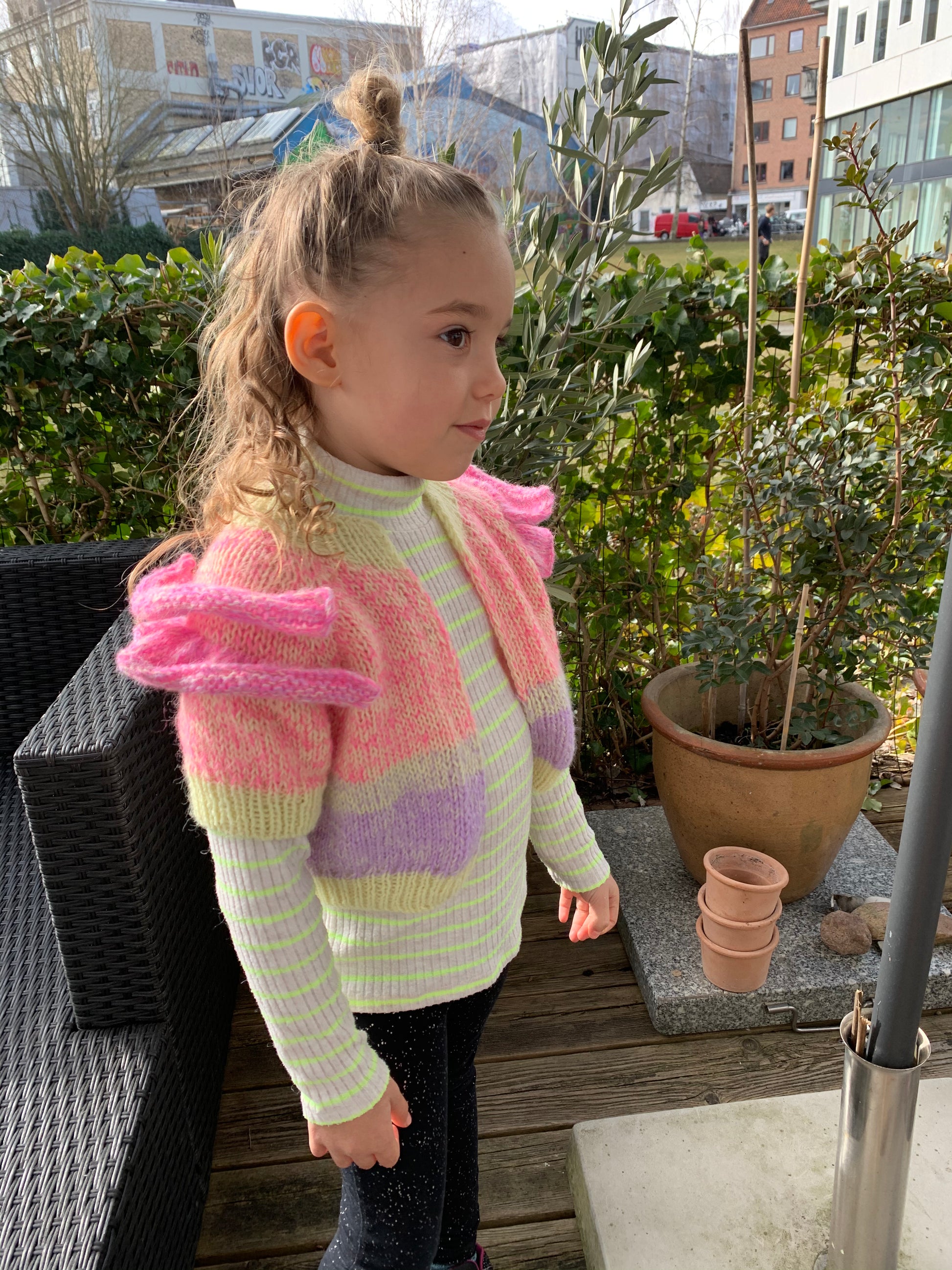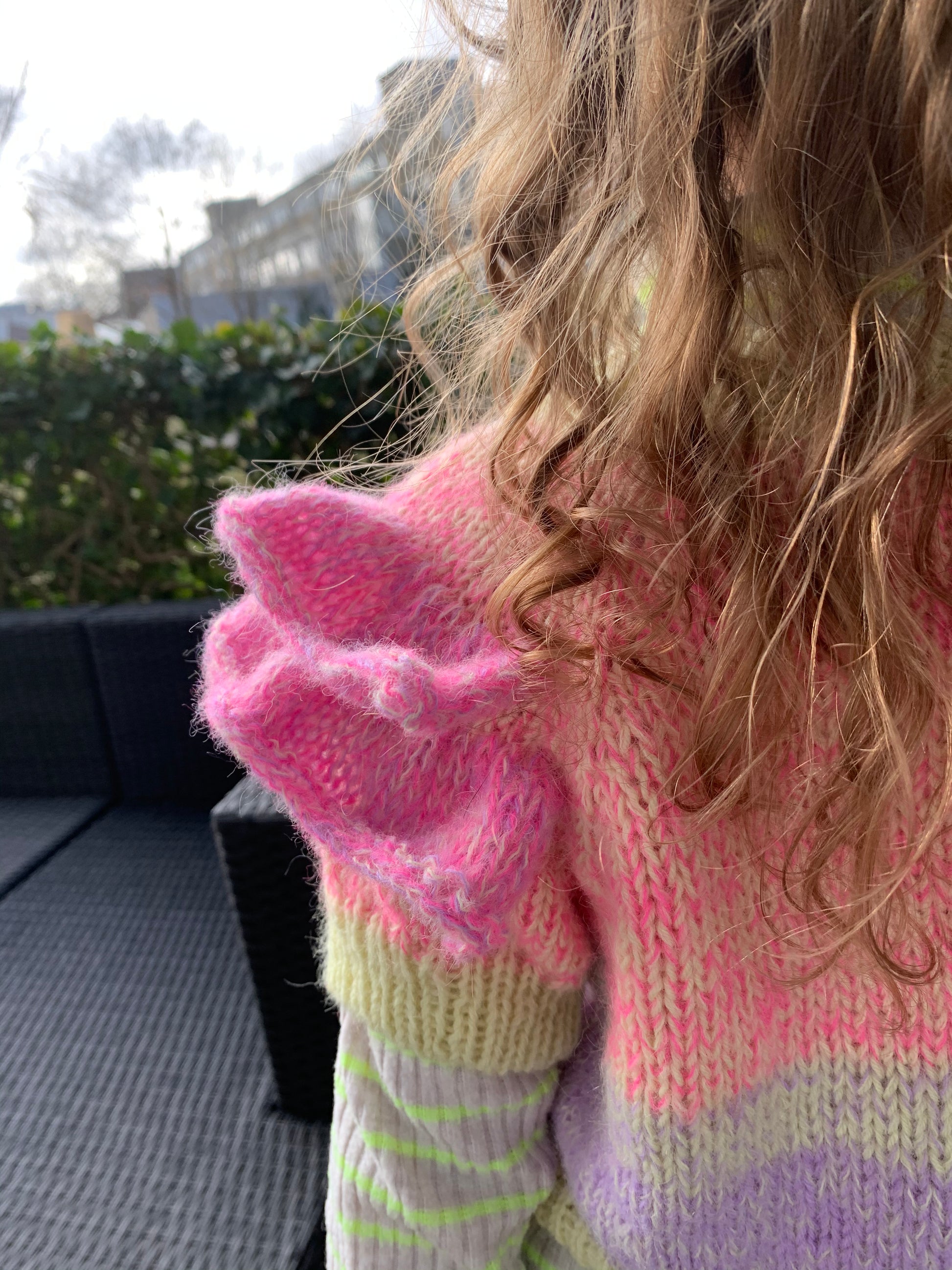 Flæsegalore Cardigan Junior er en rigtig girly model, med overdådige flæser, og mulighed for masser af spræl. Den strikkes oppefra og ned ved at lave raglanudtagninger undervejs. Cardiganens bærestykke og krop strikkes frem og tilbage, hvorimod ærmerne strikkes rundt. Jeg har valgt at forhøje nakken for et bedre fit ved hjælp af vendepinde, og teknikken German short rows. Du strikker din ribkanter ned langs kroppen samtidig, ved at strikke de første og sidste masker på hver pind i rib. Når alle udtagningerne er strikket, sættes ærmemaskerne på hold, imens resten af kroppen strikkes færdigt. Derefter sættes ærmemaskerne tilbage på din rundpind og strikkes færdige hver for sig. Ærmerne kan strikkes både korte eller lange, opskriften indeholder selvfølgelig begge muligheder. Cardiganen er ikke ment til at skulle knappes, men bare stå åben. Ønsker du dog, at den skal knappes, kan du med fordel sætte trykknapper i til sidst eller sy knaphuller i den færdige ribkant ved hjælp af knaphulssting. Som prikken over i´et samles der masker op i vrangborderne du har tilføjet i starten og strikkes flæser. For et lettere udtryk i flæserne, kan du strikke dem med 2 tråde mohair i stedet for merino.