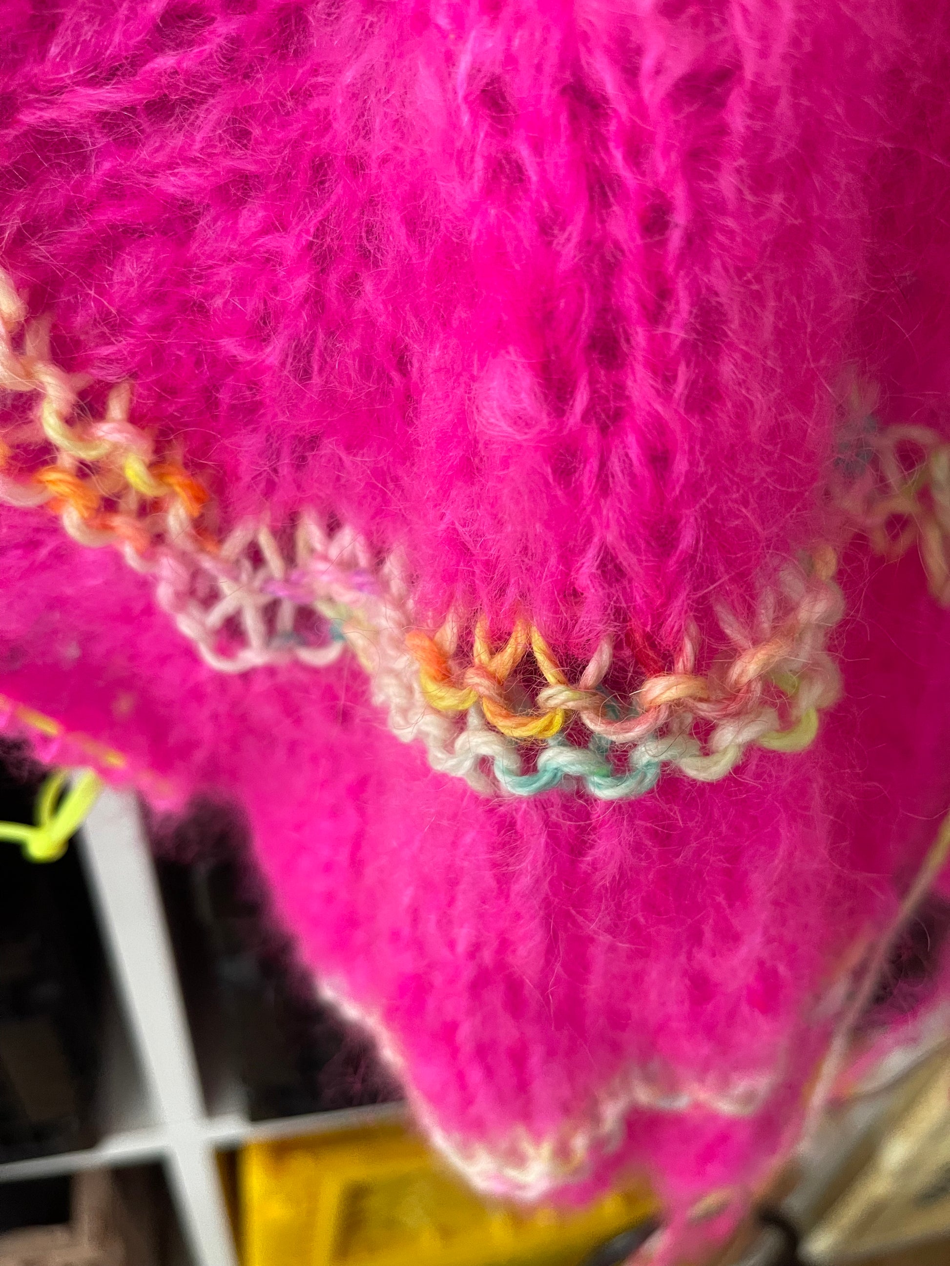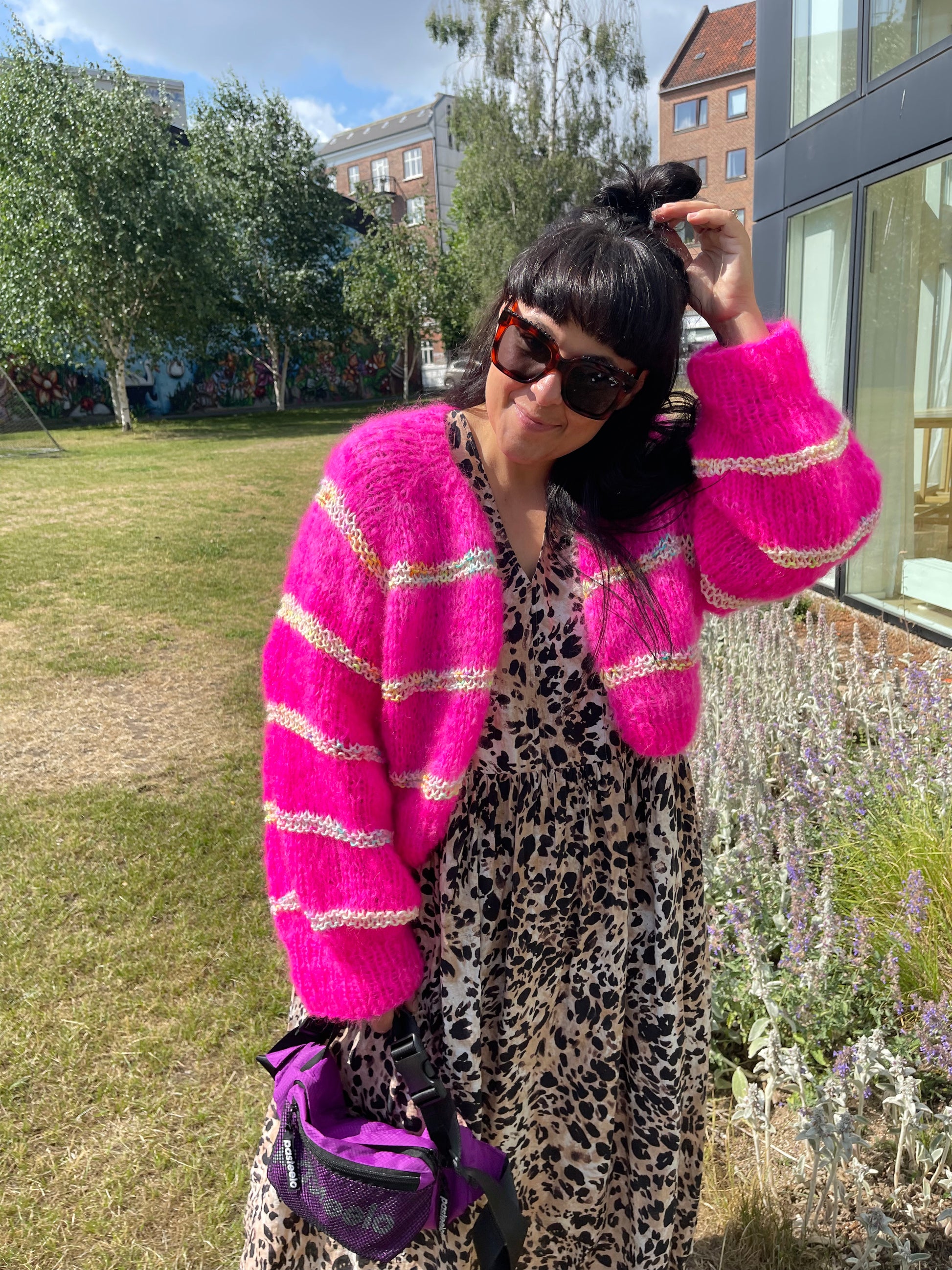 Flaming Flamingo Cardigan er en oversize vamset cardigan, strikket med en enkel tråd chunky mohair på store pinde. Den strikkes oppefra og ned, med klassiske raglan udtagninger. For et bedre fit, strikkes der vendepinde i starten af arbejdet. De fine striber strikkes ved, at skifte garnet ud med en enkelt tråd DK Weight merino/alpaca og der strikkes skiftevis 1 omg ret, 1 omgang vrang over 4 omg. Modellen er som mange af min cardigans cropped, men kan selvfølgelig forlænges om nødvendigt. Ærmerne har lidt ekstra længde og brede ribkanter for at de får et lidt hyggeligt look.