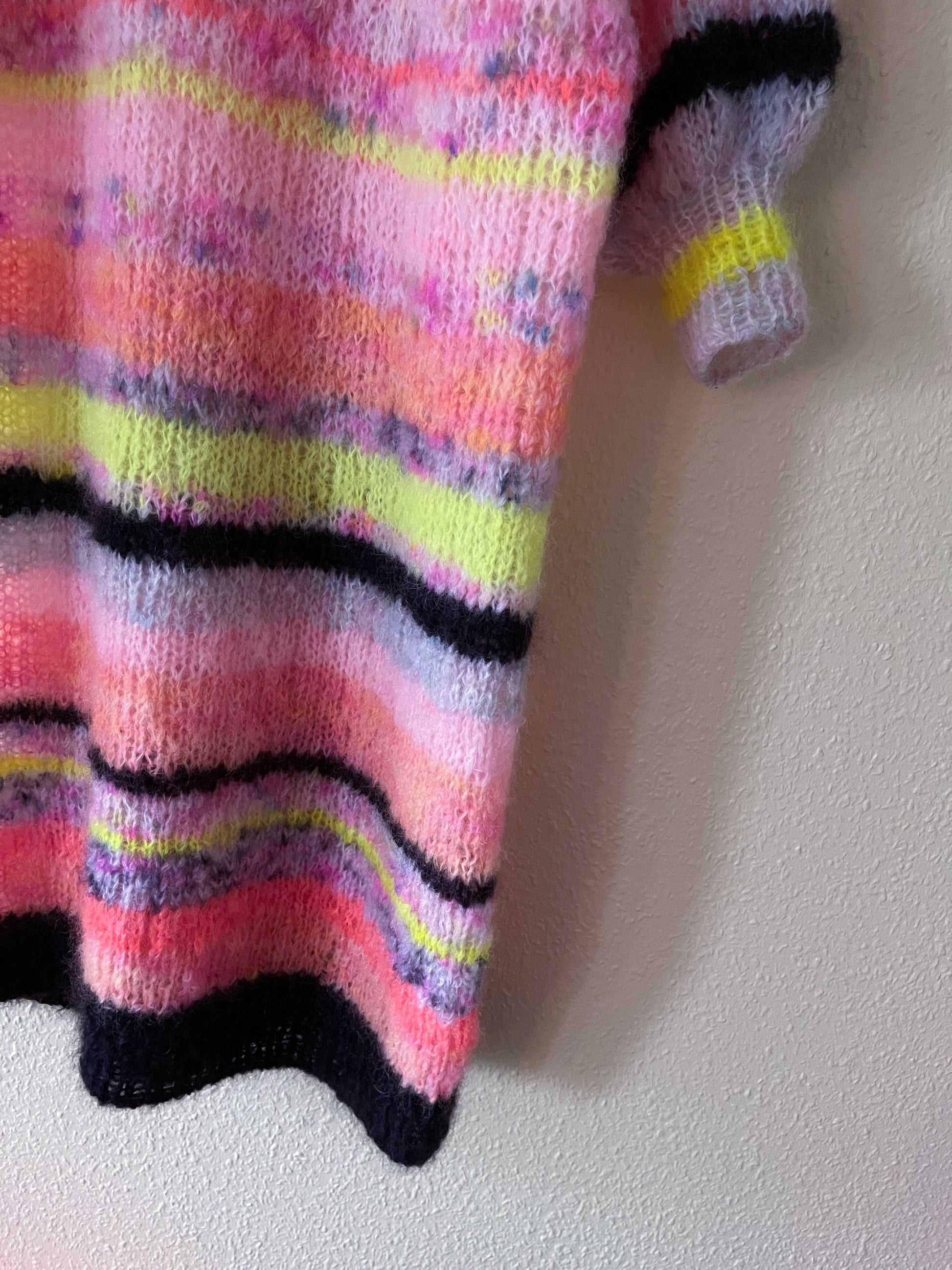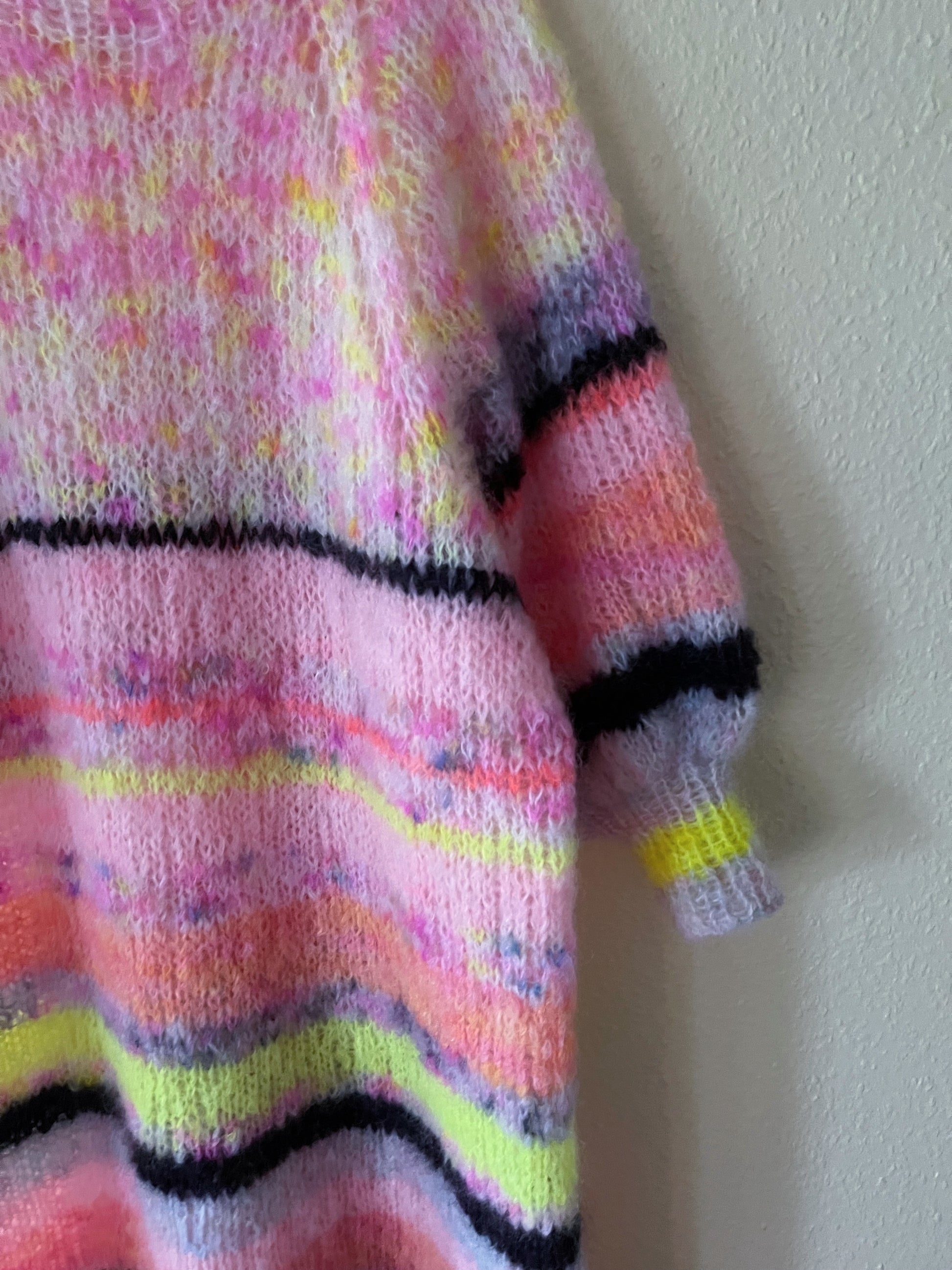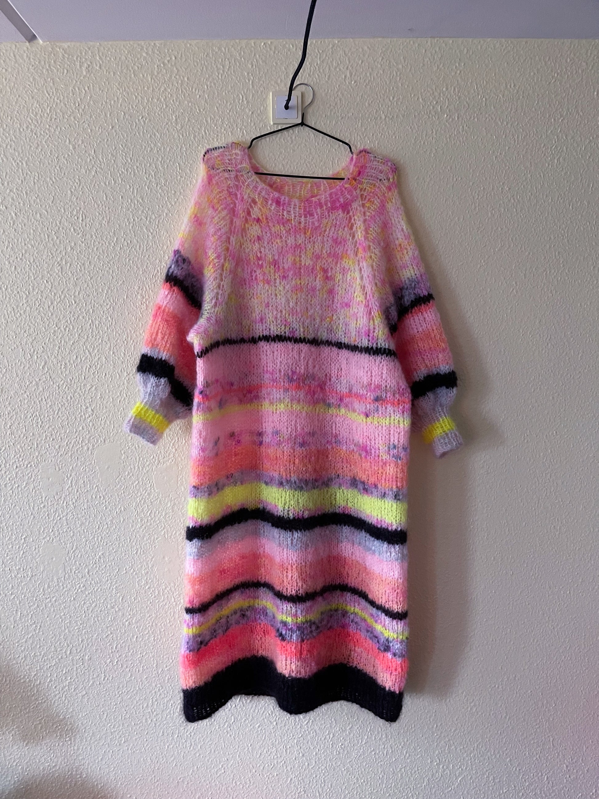 Flashdance Dress er en oversized model med et luftigt maskebillede. Den strikkes oppefra og ned med kun 1 tråd Chunky Mohair eller lign. på p 8 mm. Nakken forhøjes ved hjælp af vendepinde (German short rows), samtidig med at du starter på dine udtagninger. Når alle udtagningerne er strikket, sættes ærmemaskerne på hold, imens resten af kjolen strikkes færdig. Til sidst sættes ærmernes masker tilbage på en rundpind og strikkes færdige hver for sig.