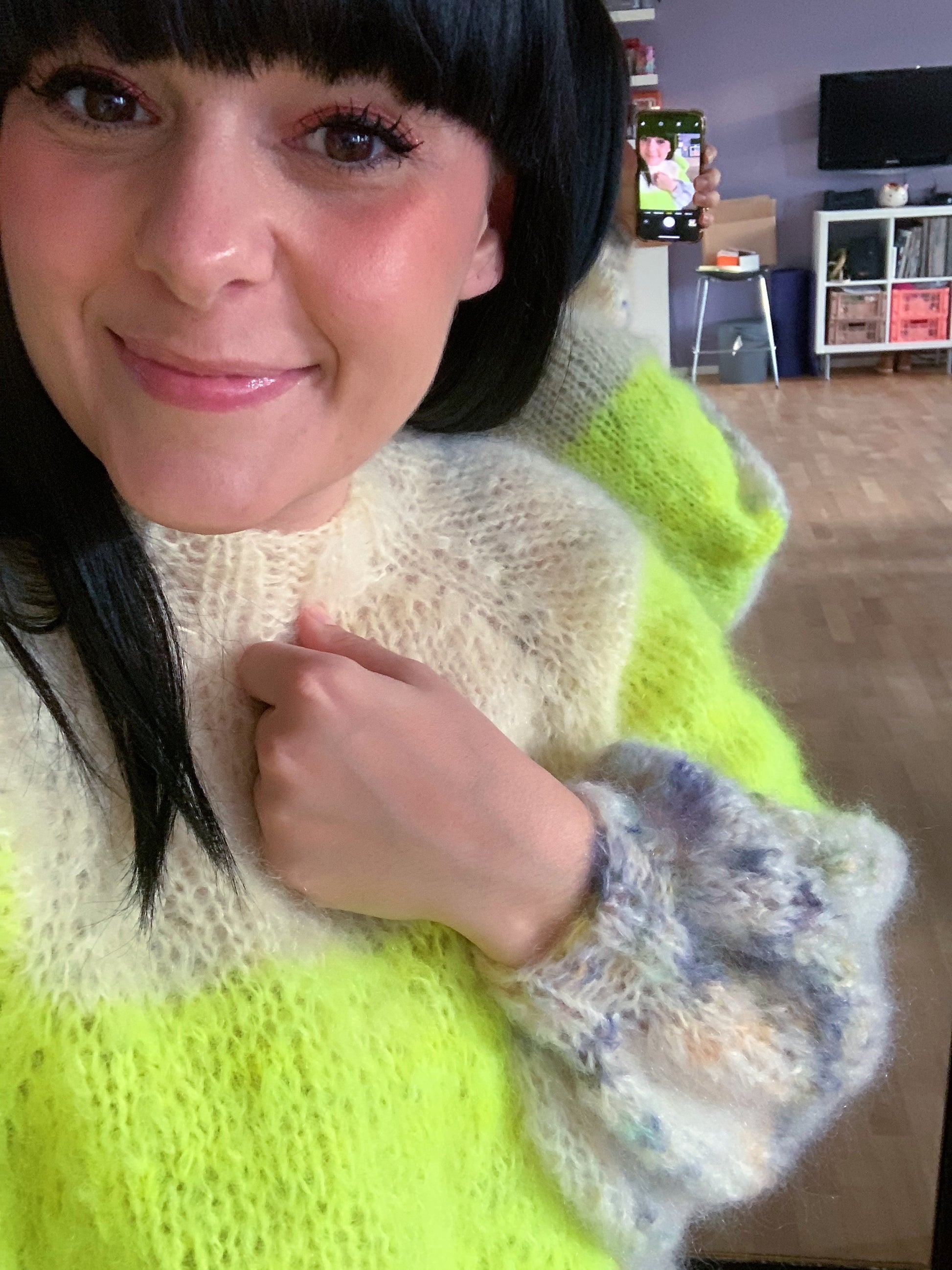 The Flashdance Sweater is an oversized, airy knit with chunky rib edges for a sporty look. The neckline is raised using short rows to improve the fit. I use the German short row method while increasing on both the right and wrong sides. It is knit from the top down and requires no seaming. When all increases have been worked the sleeve stitches are put on hold while the rest of the body is knit. The sleeves are then put back on the needles and knit one after the other.