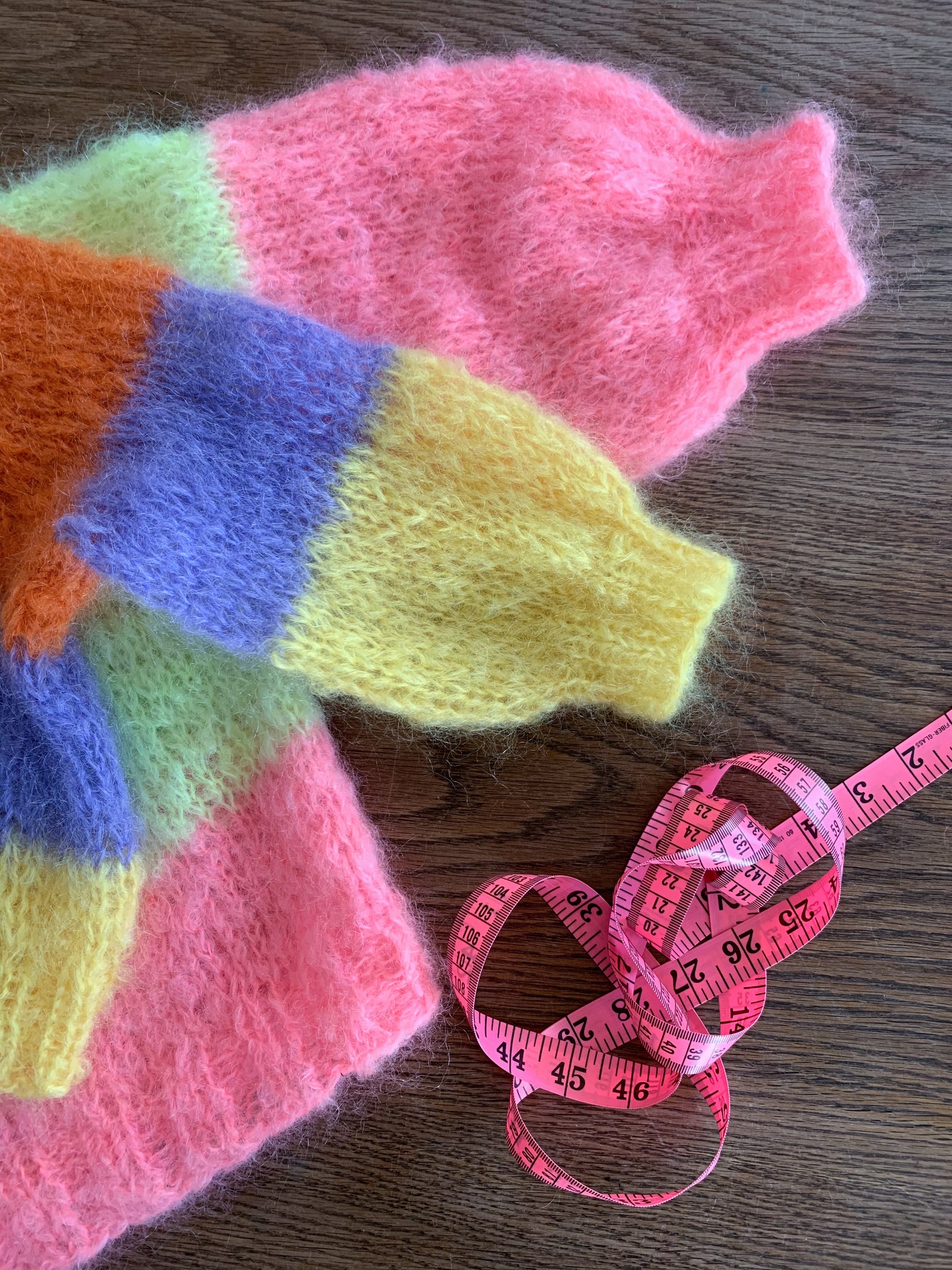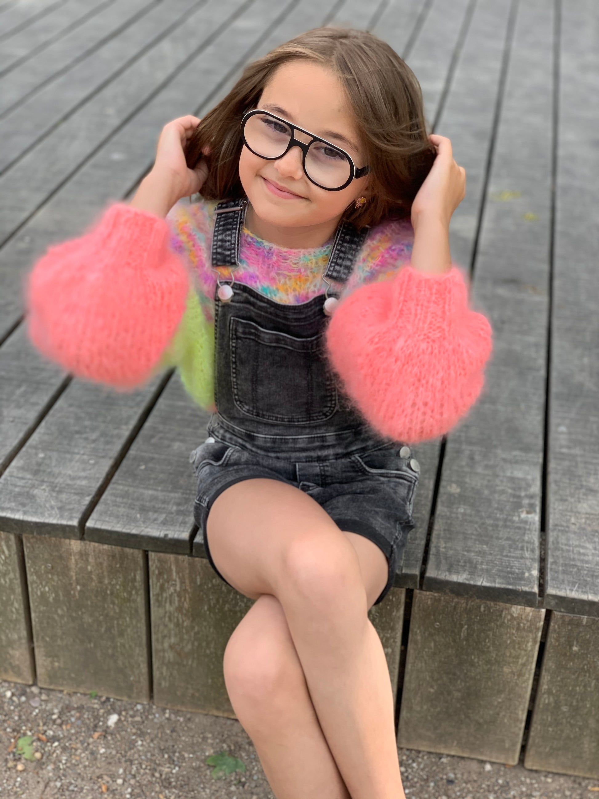 Flashdance Sweater Junior er en unisex model, lettere oversized, luftige masker med kanter i dobbeltrib for et mere sporty look. Jeg har valgt at forhøje nakken for et bedre fit ved hjælp af vendepinde, og metoden German short rows. Samtidig med at nakken forhøjes, strikkes der udtagninger på både ret- og vrangsiden. Sweateren strikkes oppefra og ned, ved at lave raglanudtagninger undervejs og er dermed monteringsfri. Når alle udtagningerne er strikket, sættes ærmemaskerne på hold, imens resten af kroppen strikkes færdig. Ærmerne sættes til sidst tilbage på en rundpind og strikkes færdige hver for sig.