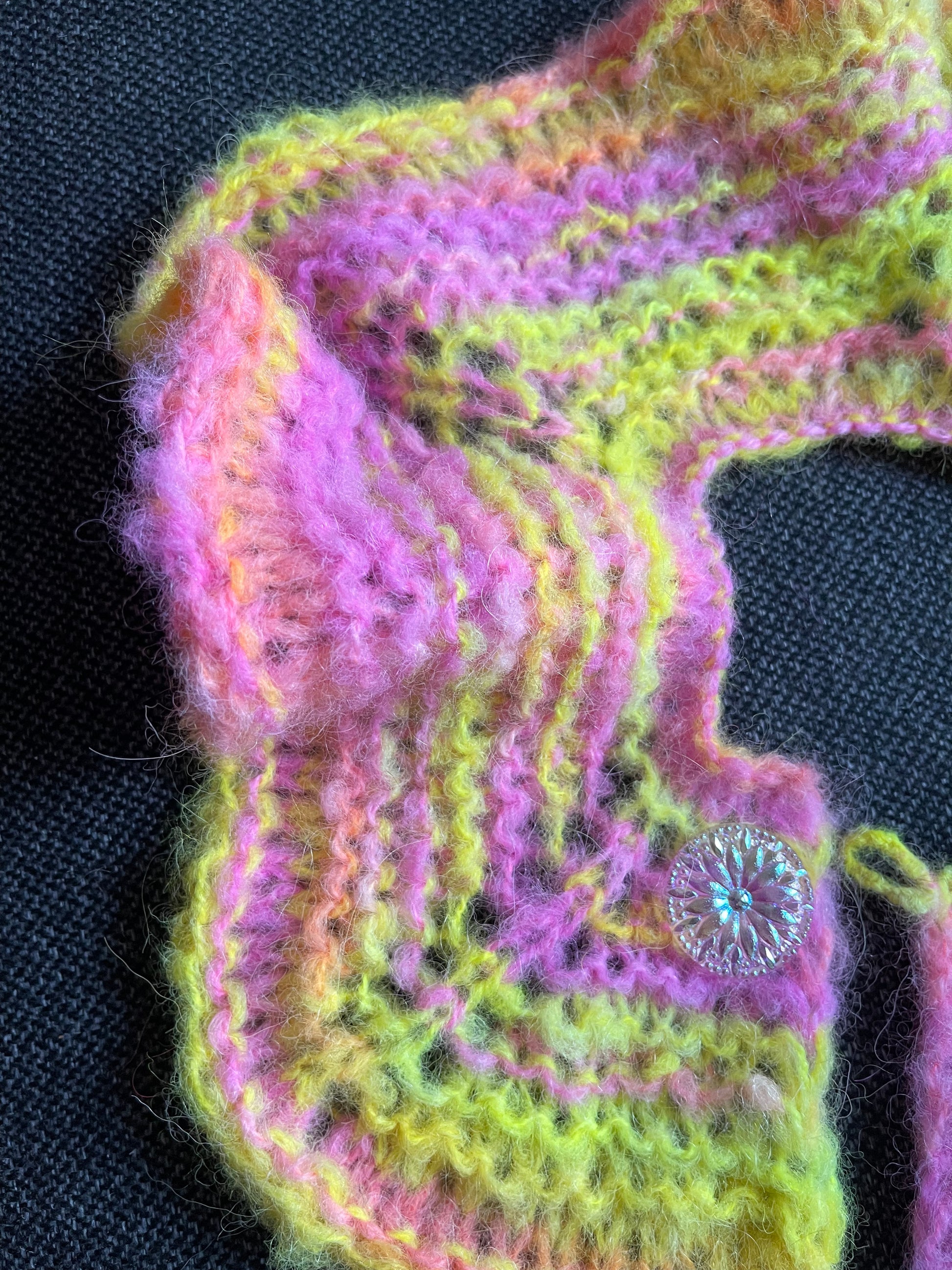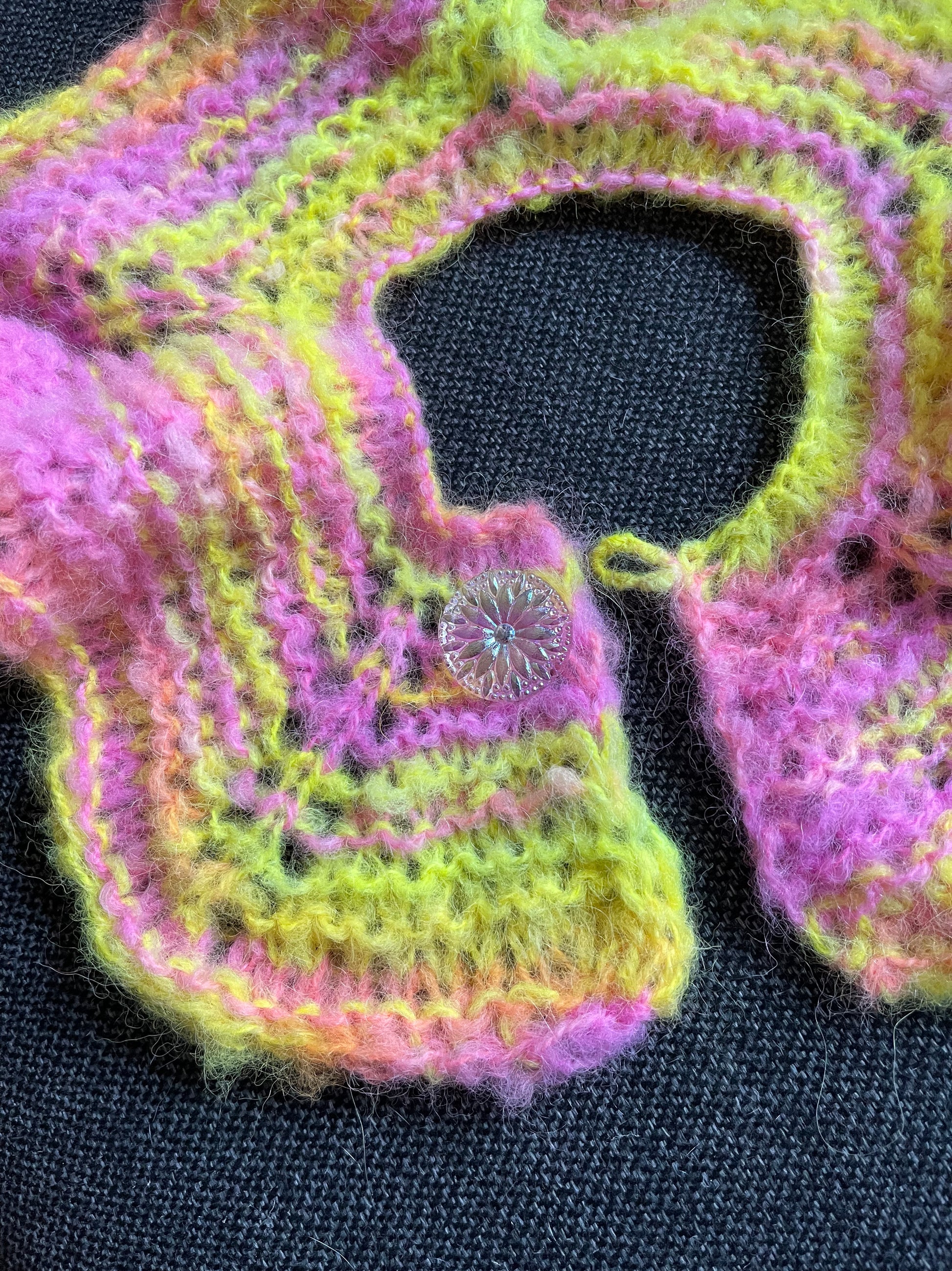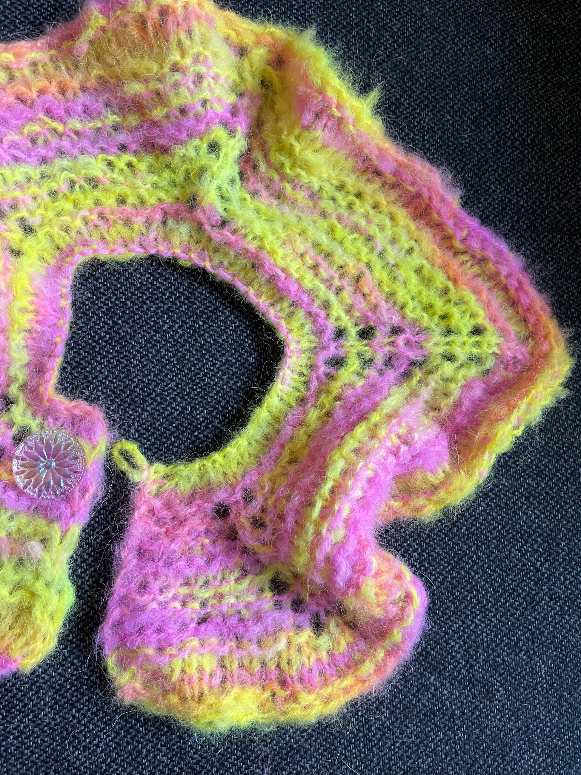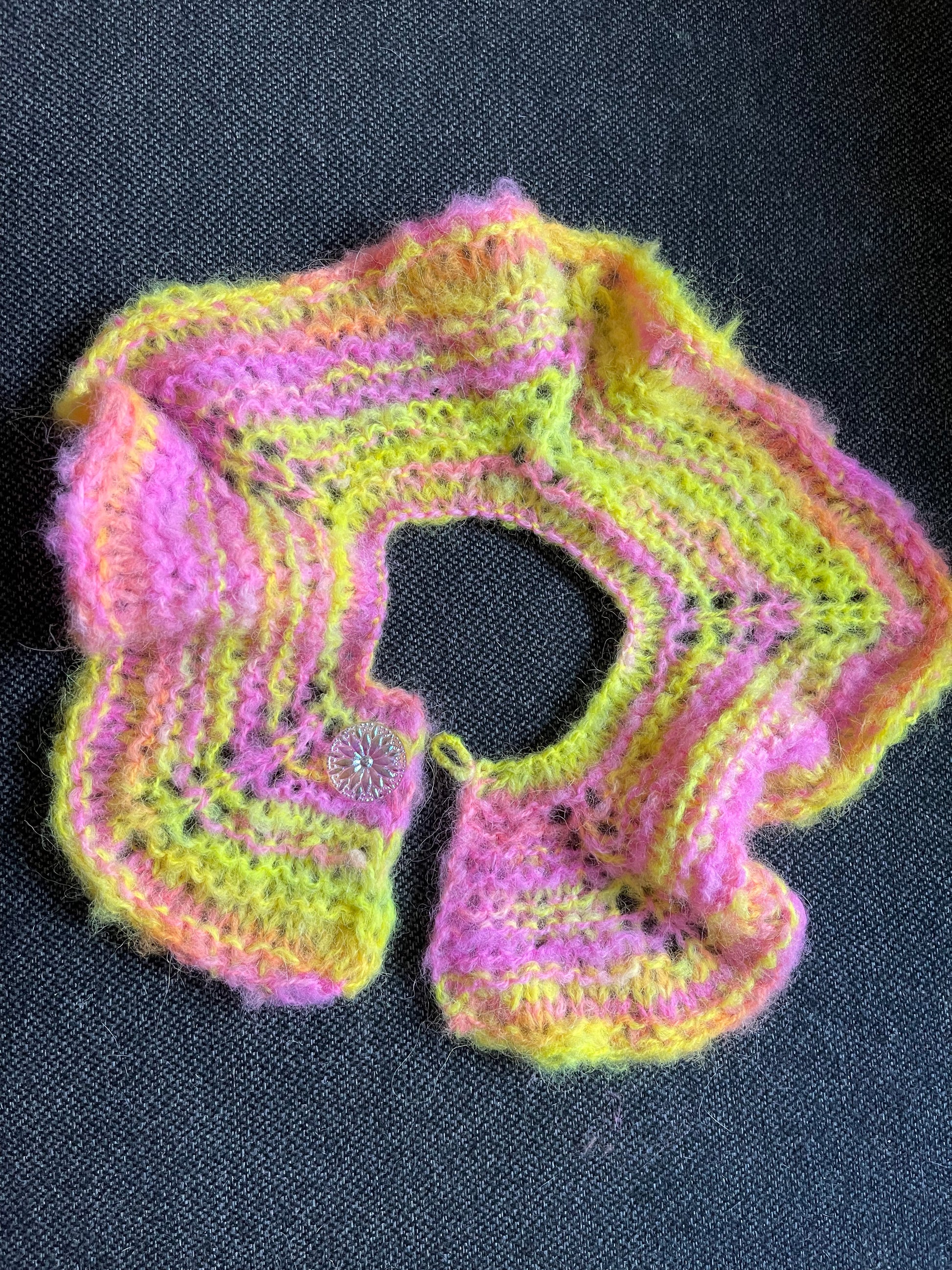 Fluffy Collar er en sjov & feminin pyntekrave. Brug den ud over kjoler, shirts eller dine klassiske sweatre for lidt ekstra lir. Den er nem og hurtig at strikke. Og kan strikkes i et hav af forskellige kombinationer. Den strikkes frem og tlbage i glatstrik. Og der laves udtagninger med dekorative huller som på en sweater. Du kan vælge at lave en knaphuls transe til sidst, eller bruge en broche til at lukke den med. Alle teknikker, der er brugt i opskriften, er beskrevet herunder, og der er, ligeledes videolinks til de fleste af dem.