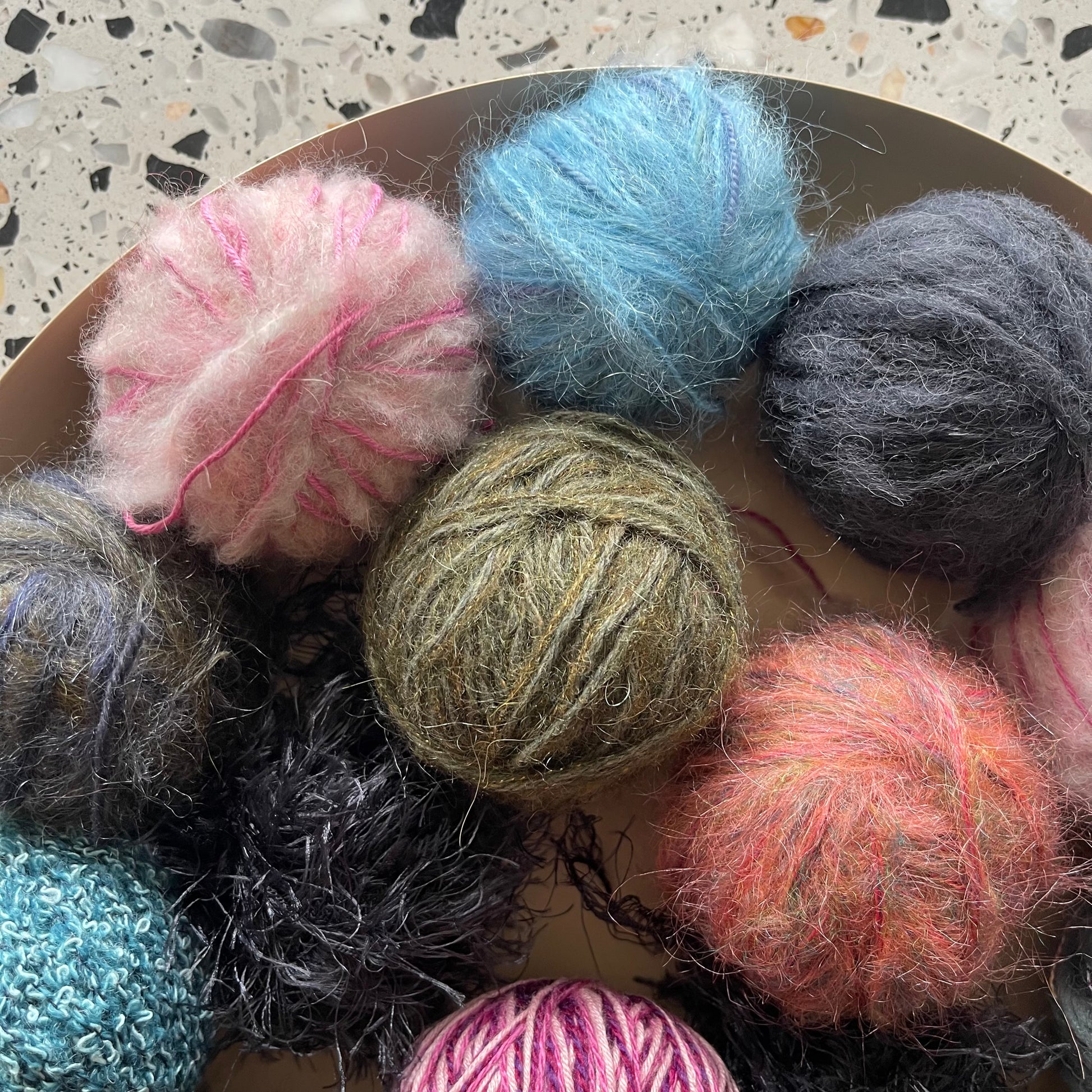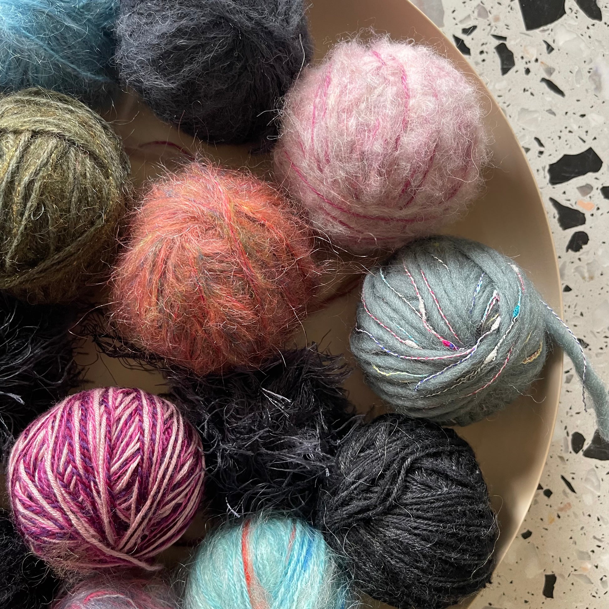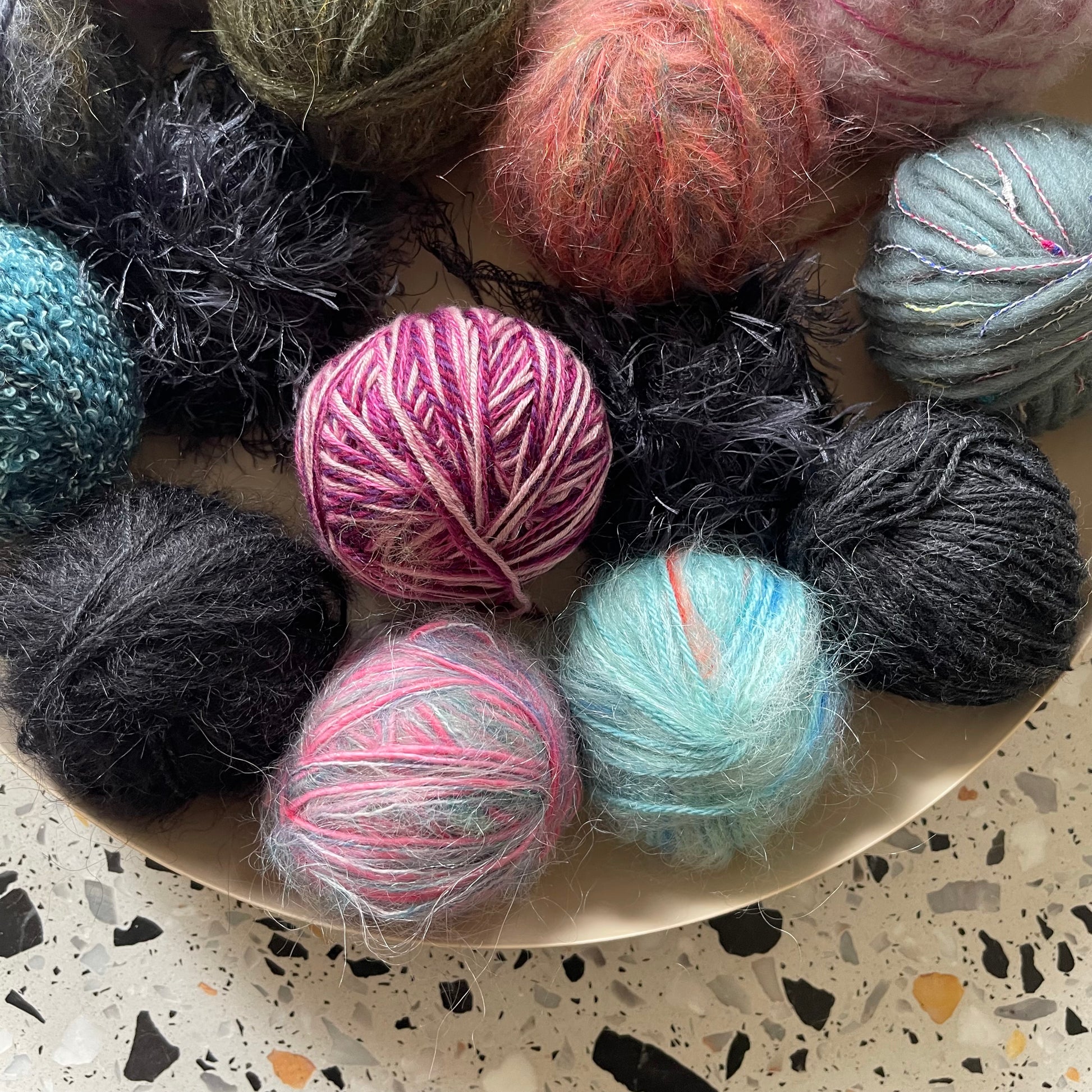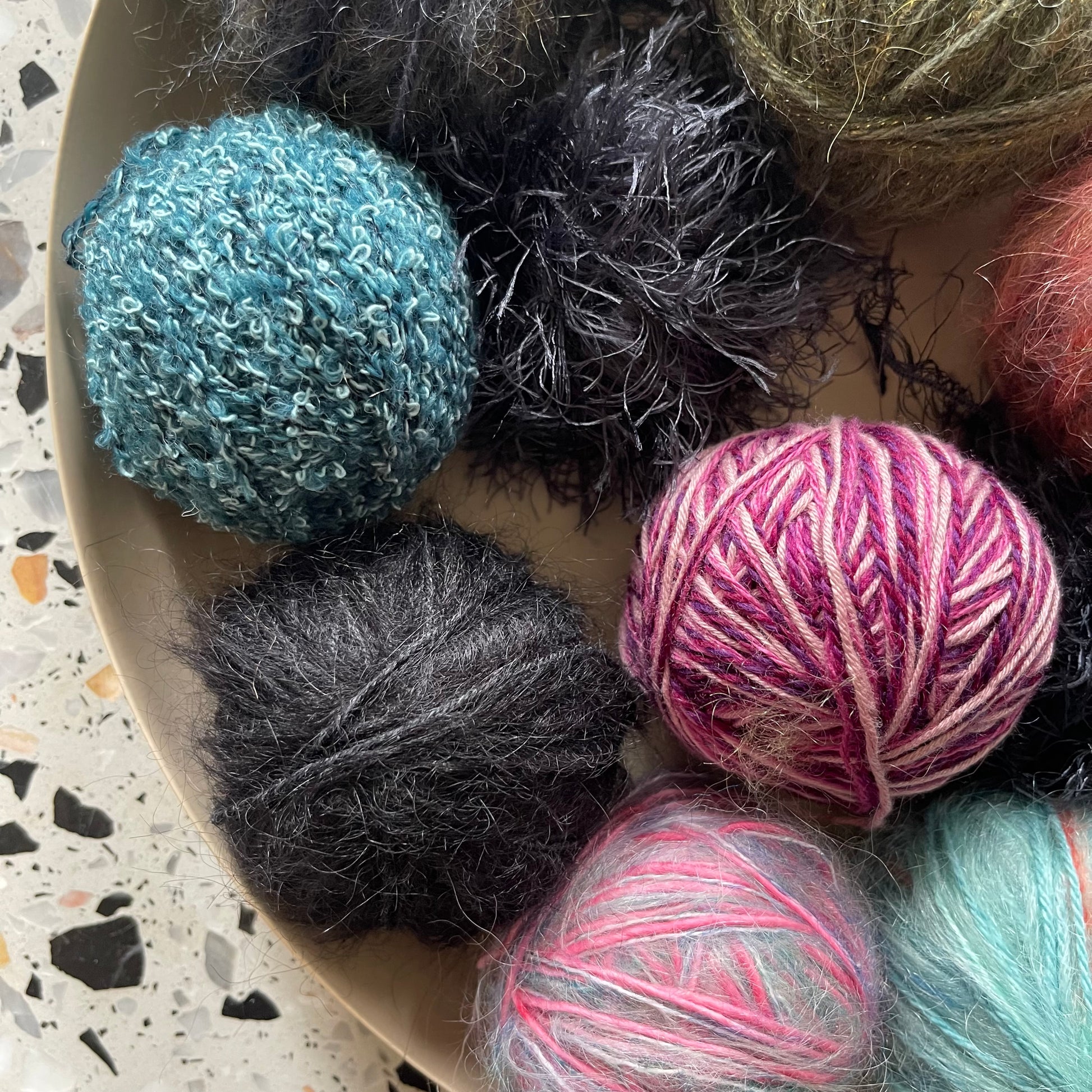 Denne garnpakke er sammensat med stor omhu, masser af kærlighed, og er ONE off a kind. Jeg har ud fra et farvetema, sammensat og rullet en masse lækre nøgler bestående af 1, 2 eller 3 tråde garn. De forskellige garner er af kvaliteter som Mohair og Merino i forskellige tykkelser of farver. Nogle af nøglerne er tilsat glimmer, dutter eller pels, også kaldet effektgarn.