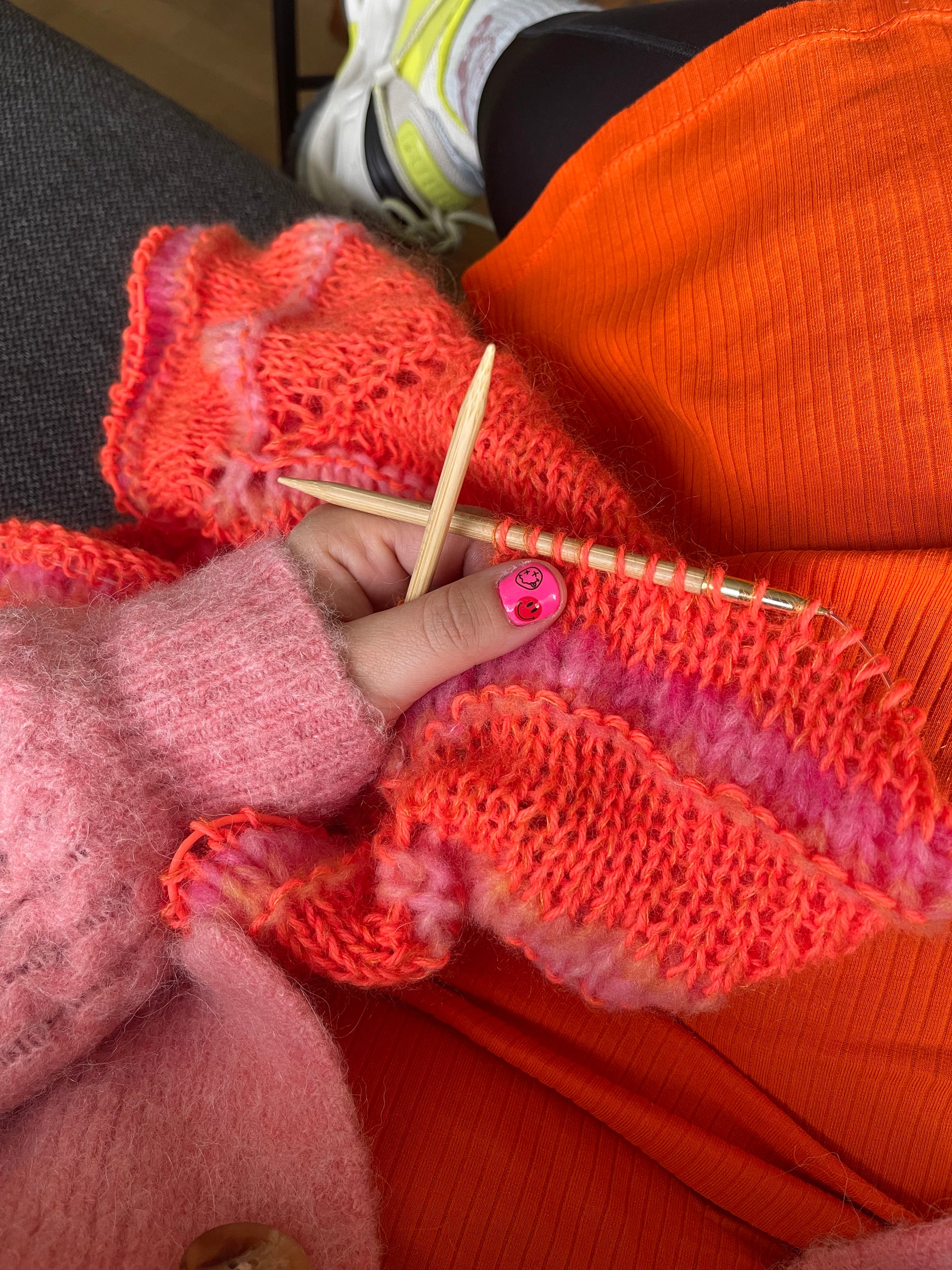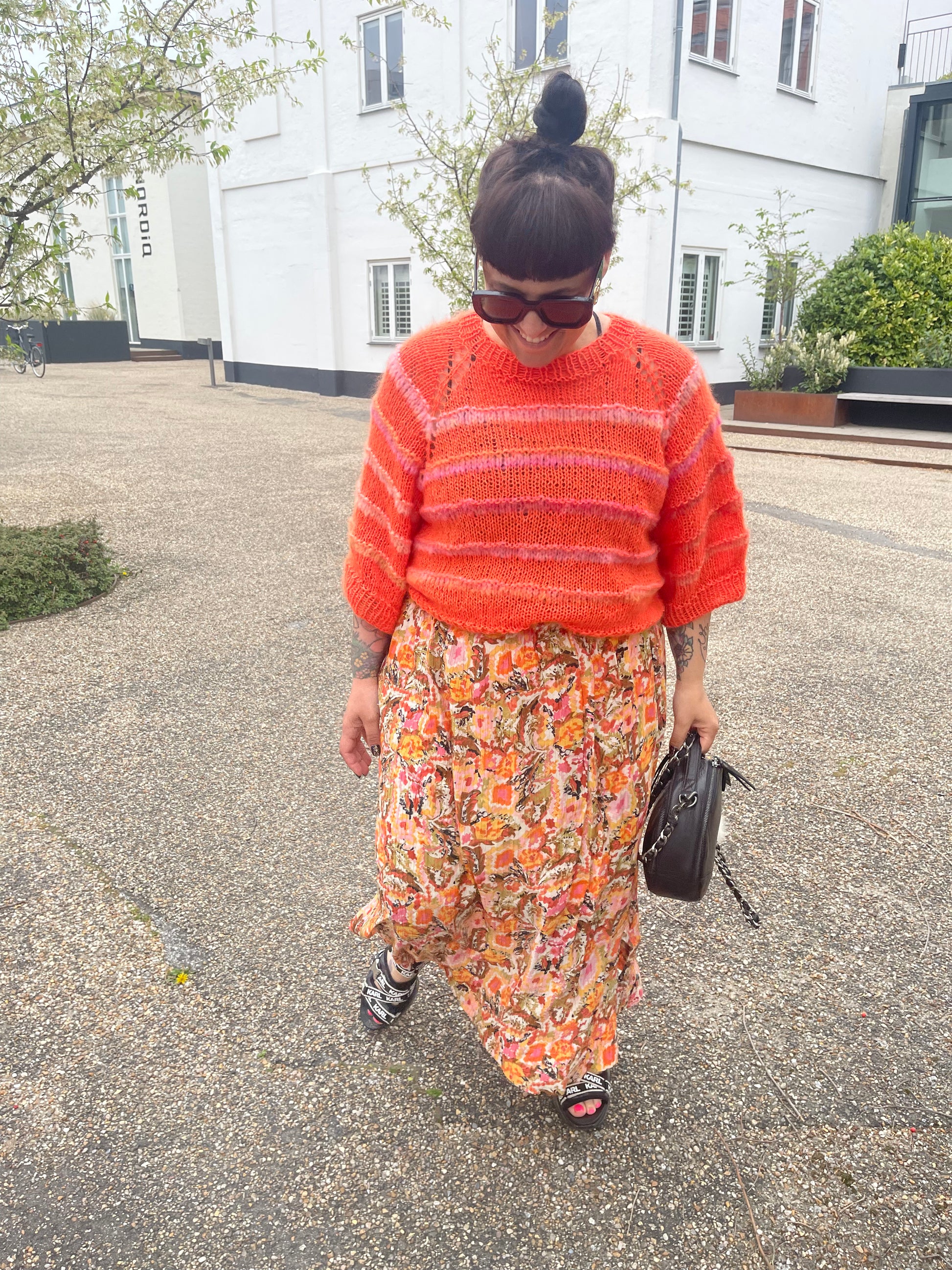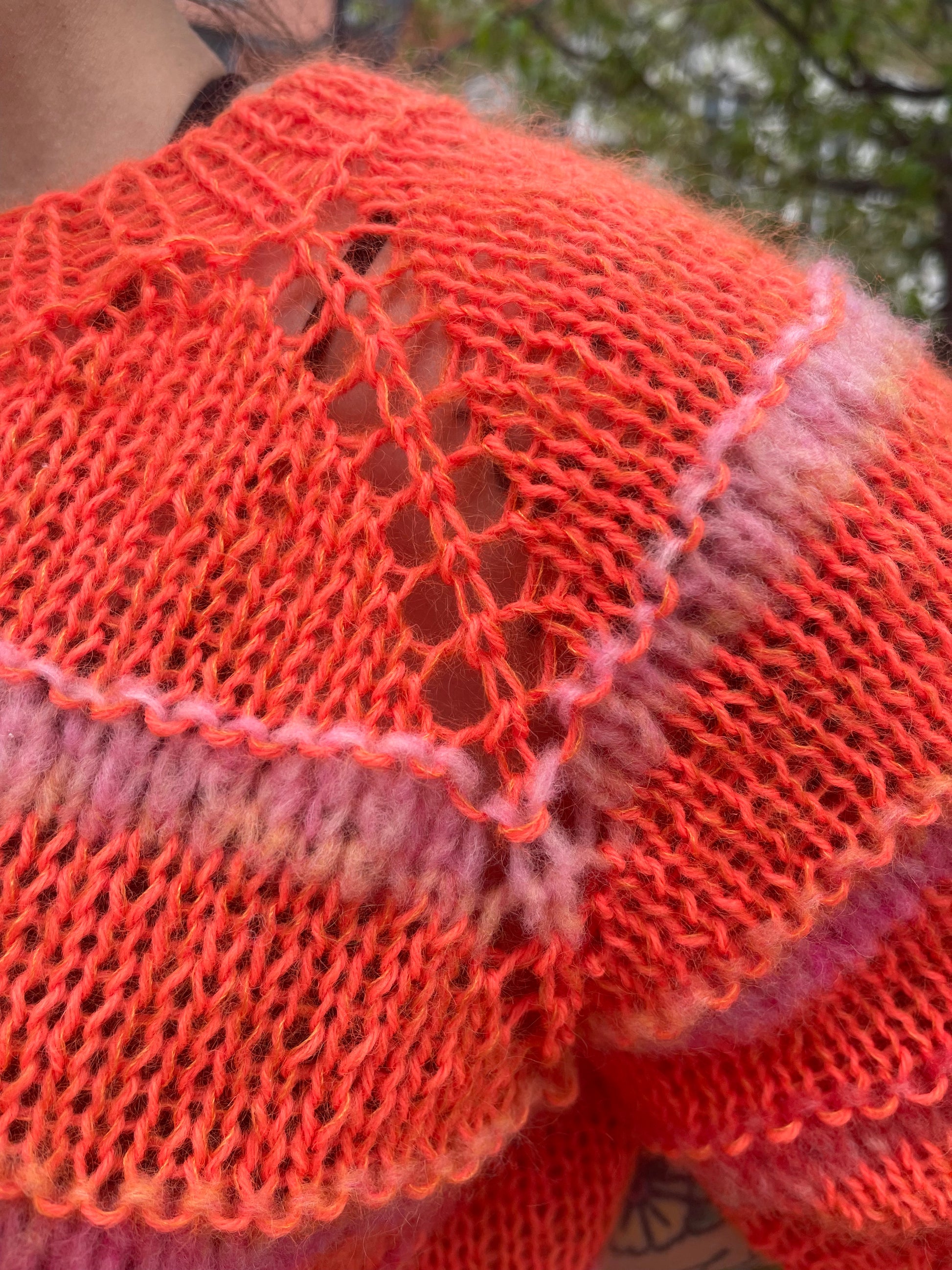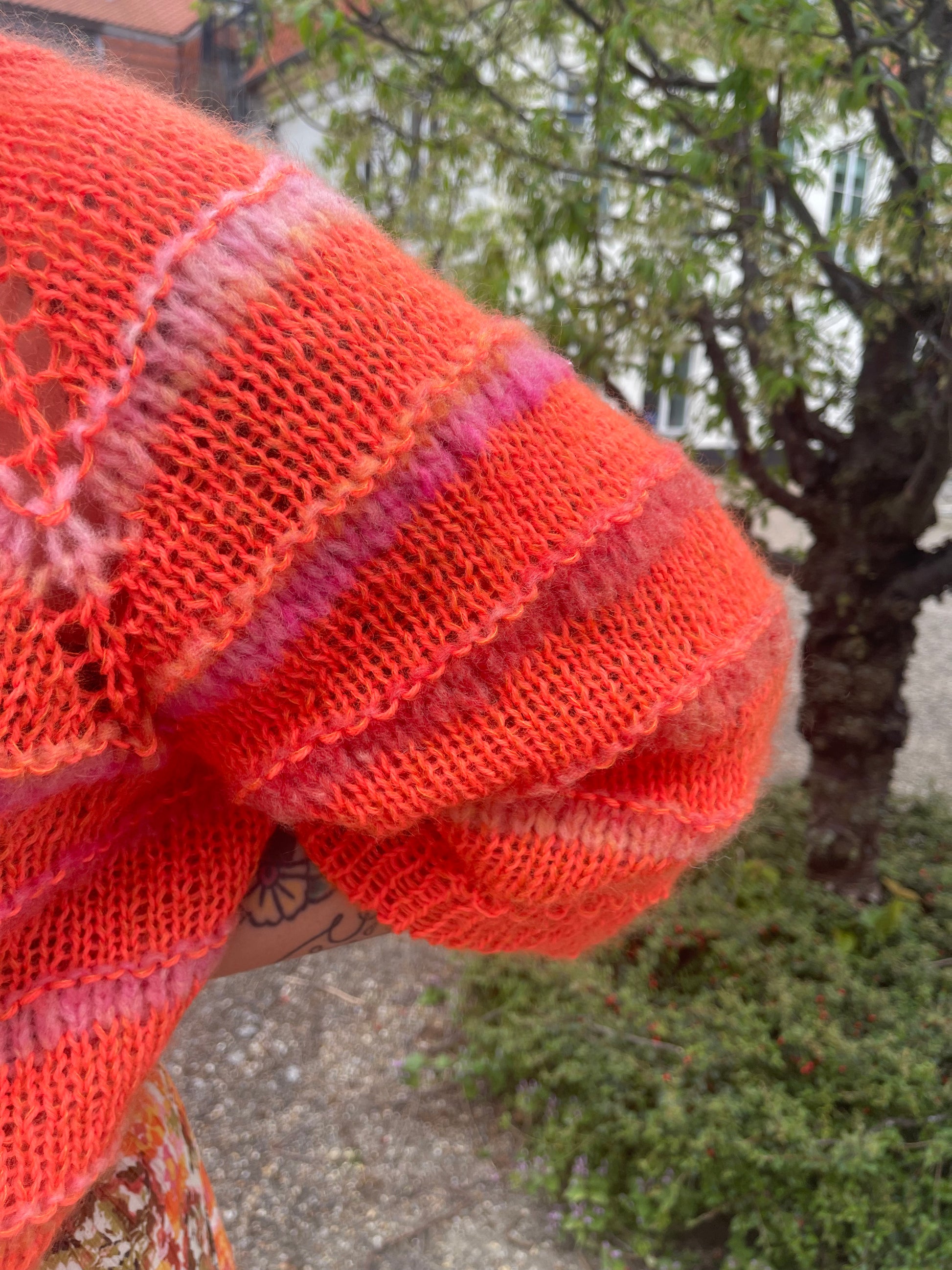 Denne model har en tilpas lækker, og oversize pasform. Den er egentlig ganske simpel, men med lidt få detaljer som dekorative udtagninger, samt striber og vrangsektioner, får den et mere sporty udtryk. Den er strikket oppefra og ned, med vendepinde i nakken for et bedre fit. De dekorative udtagninger, strikkes ved at man slår om pinden, og dermed skaber et hul, samtidig med at, du tilføjer flere masker på din omgang. Ærmerne sættes på hold, når bærestykket er færdigt, imens kroppen strikkes færdig. Herefter sættes de tilbage på en rundpind og strikkes færdige hver for sig.