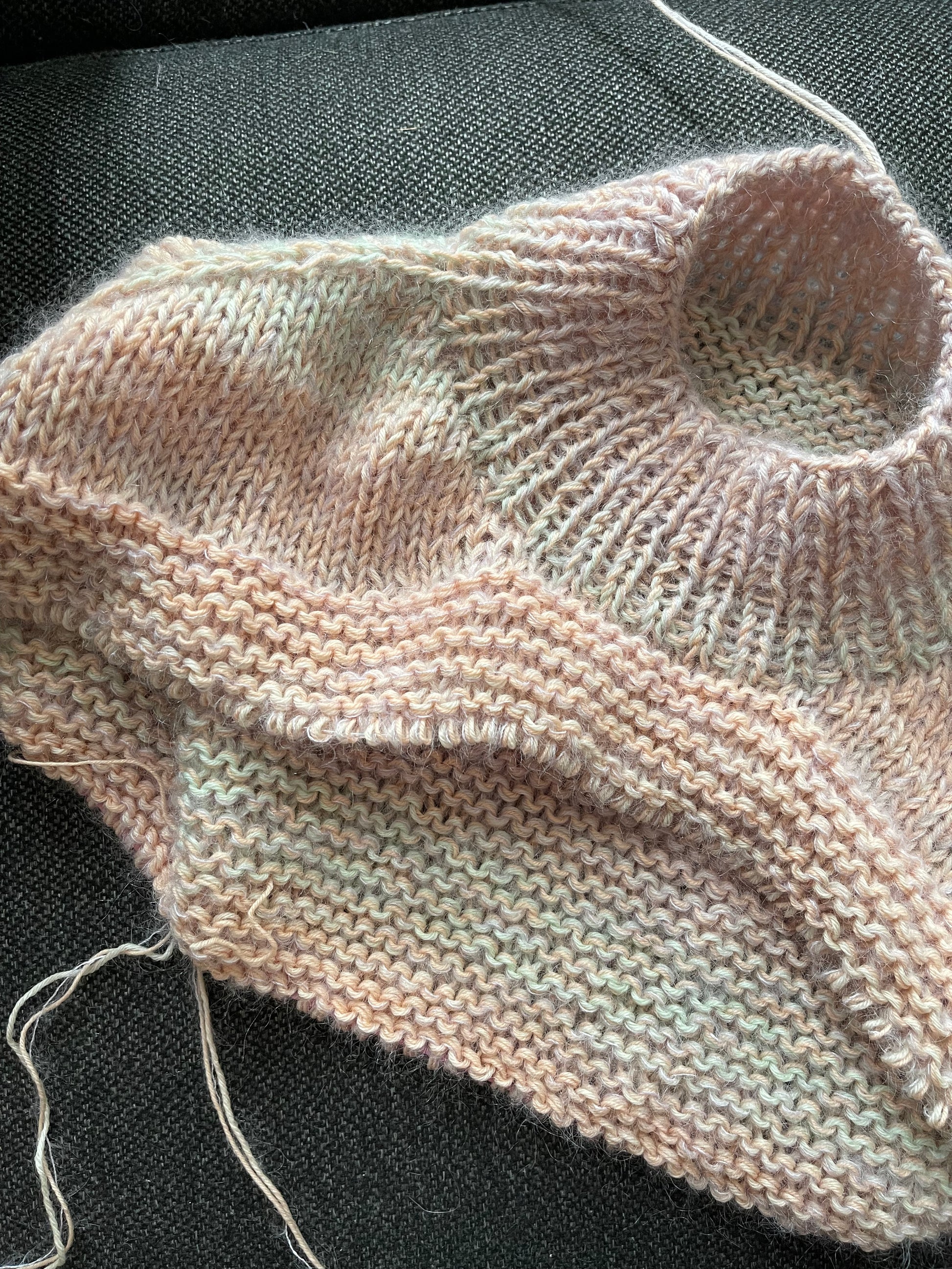 Is named after my grandmother, who was one of my biggest knitting idols. The model has an oversize fit, with voluminous sleeves, lots of structure but is ultra feminine at the same time. It is knitted from top to bottom, with reversible needles in the neck and increases from both the right and wrong sides. It is knitted back and forth on the yoke itself, gathered and finished knitting in the round. Stitches are picked up along the armhole and purl sections are added for extra volume and structure.