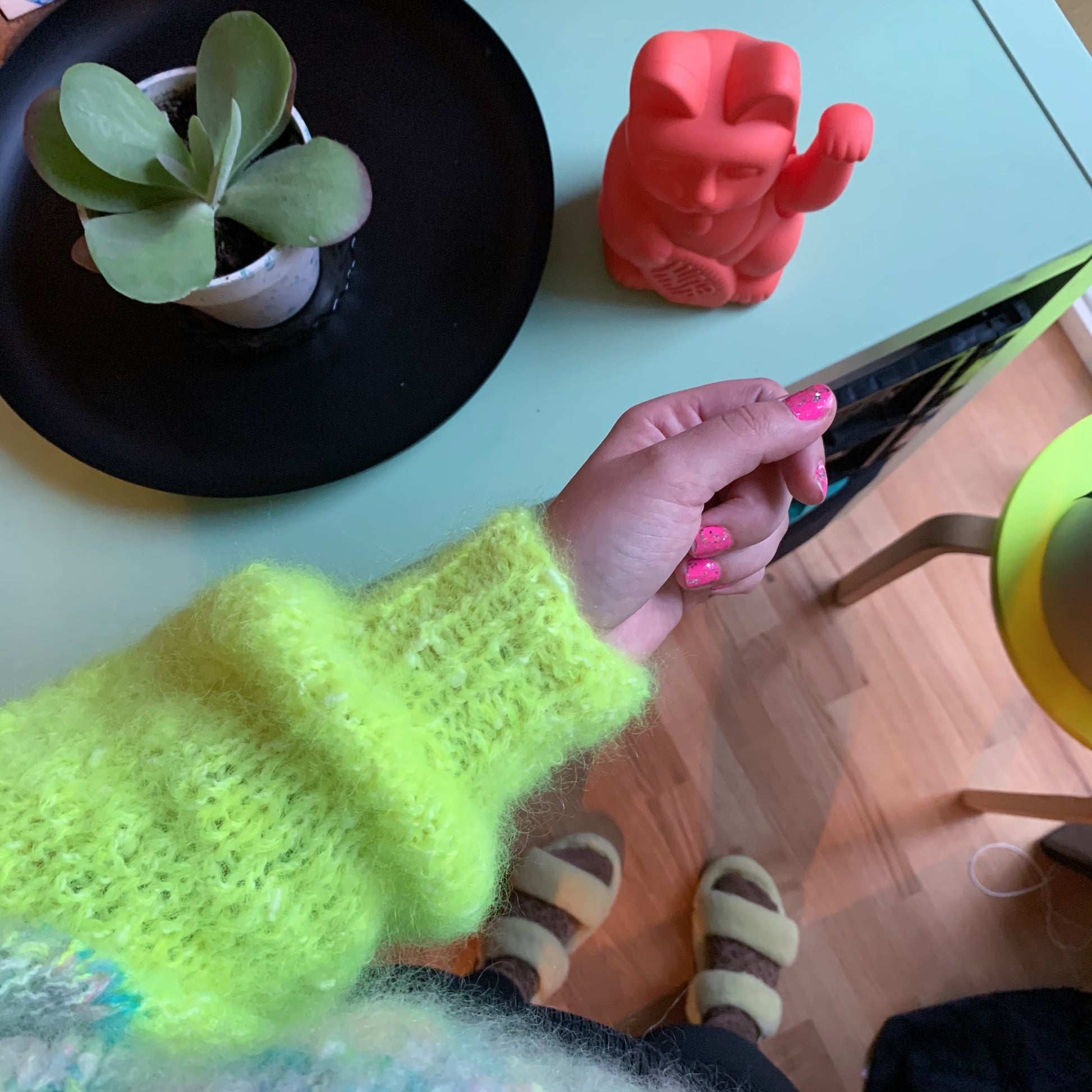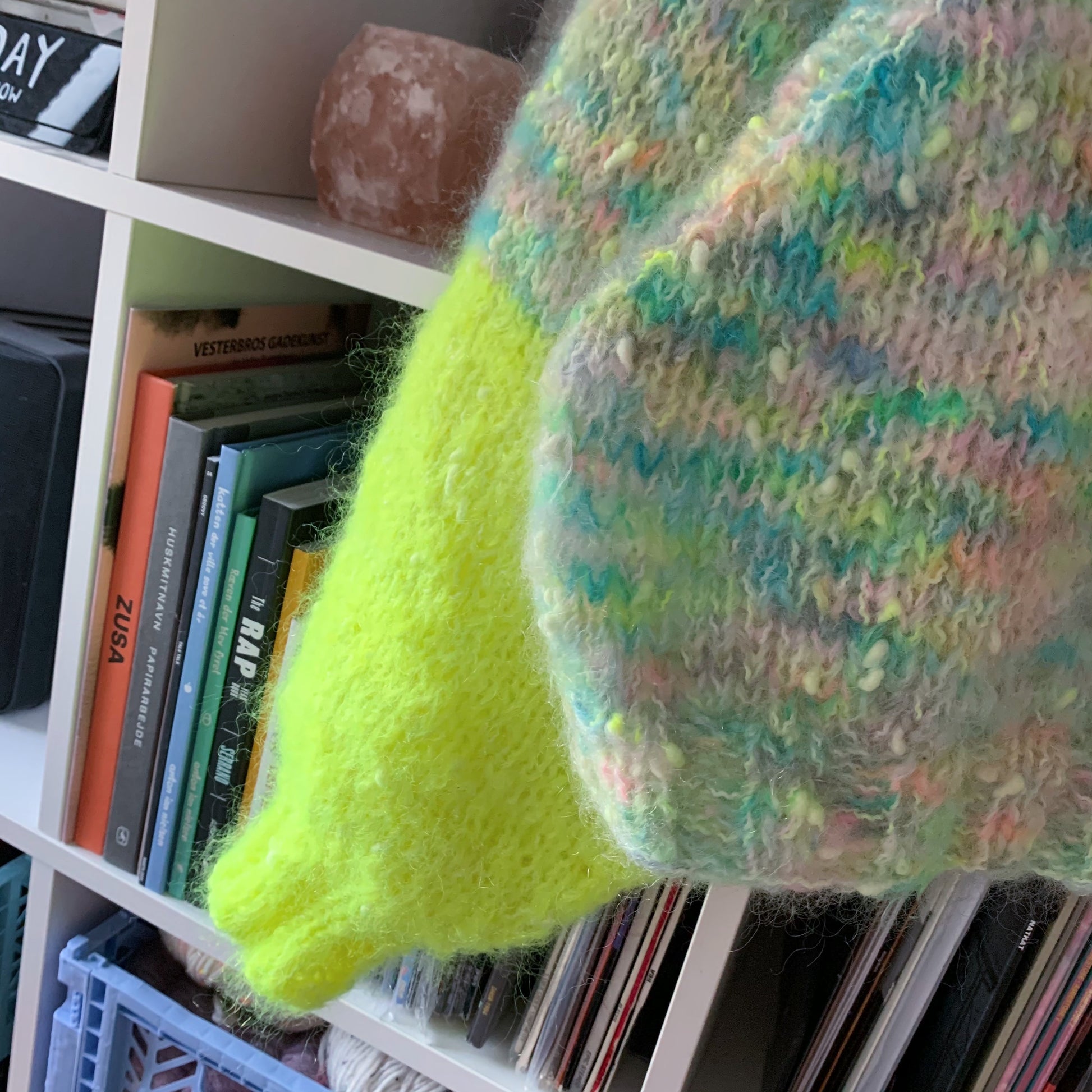 Loveslub Sweater er en model med forskellige indtagninger og udtagninger, der giver et rigtig fint, feminint og oversize fit. Den er strikket oppefra og ned, med 2 tråde holdt sammen. Du starter med at strikke den fyldige krave rundt i Dbl. rib, for derefter at strikke frem og tilbage imens du strikker de første udtagninger, samt forhøjer nakken med teknikken German Short Rows (vendepinde). Når nakken er forhøjet, sættes frontmaskerne på hold, imens du strikker første del af ryggen frem og tilbage i glatstrik. Du tager ligeledes masker ud i begge sider undervejs. Når du er færdig med rygdelen, sættes maskerne på hold, og samme procedure gentages med frontmaskerne. Når alle udtagninger på ryg- og fronten er strikket, samles arbejdet igen, og strikkes rundt indtil ønsket længde. Når kroppen er strikket færdig, samles der masker op til ærmer, der strikkes rundt i glatstrik, samtidig med der tages masker ind langs underarmen for et mere smalt fit.