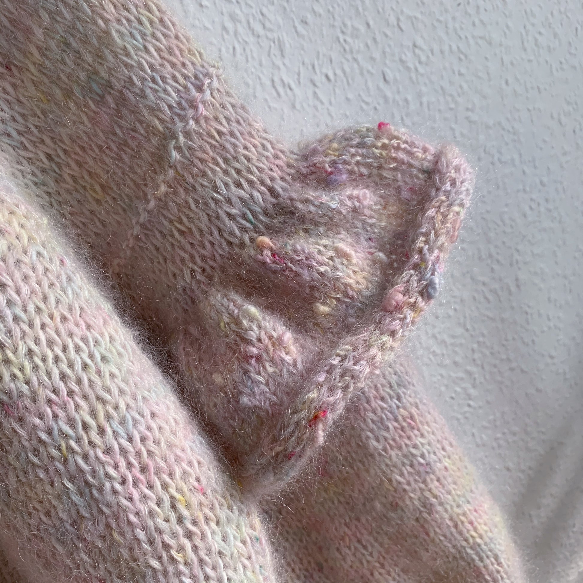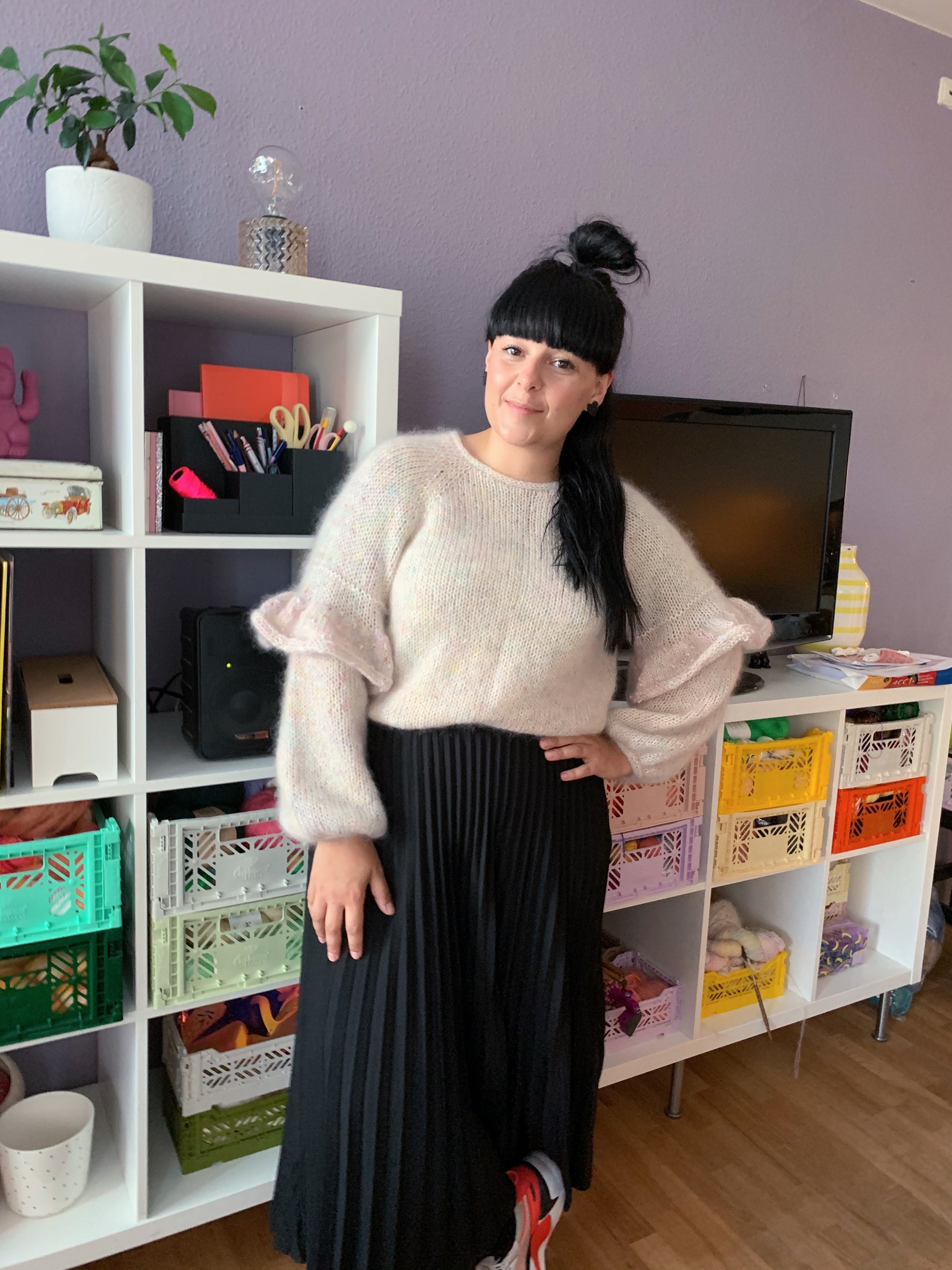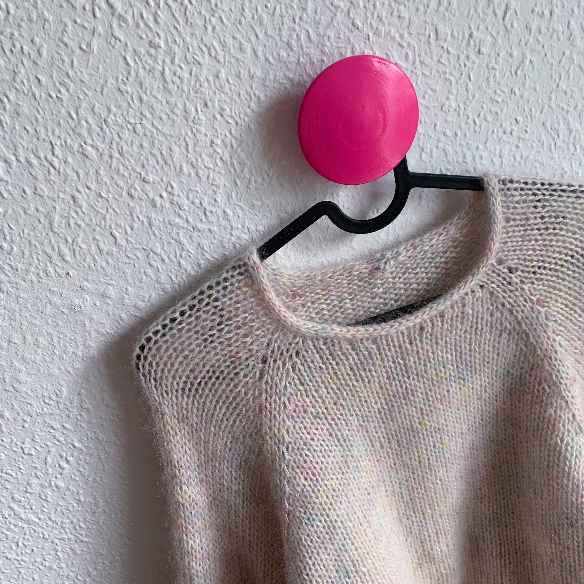 Er en fluffy, og let oversize strik med i-cord kanter ved hals, ærmer, krop og flæser. Jeg har valgt at forhøje nakken med vendepinde for et bedre fit. Jeg bruger metoden German short rows. Den strikkes oppefra og ned ved at lave raglanudtagninger undervejs, og er således monteringsfri. Når alle udtagningerne er strikket, sættes ærmemaskerne på hold, imens resten af kroppen strikkes færdig. Til slut sættes ærmemaskerne tilbage på din rundpind og strikkes færdige hver for sig. Flæsen strikkes ved at samle masker op langs en kant af vrangmasker på ærmet og strikkes ligeledes rundt.