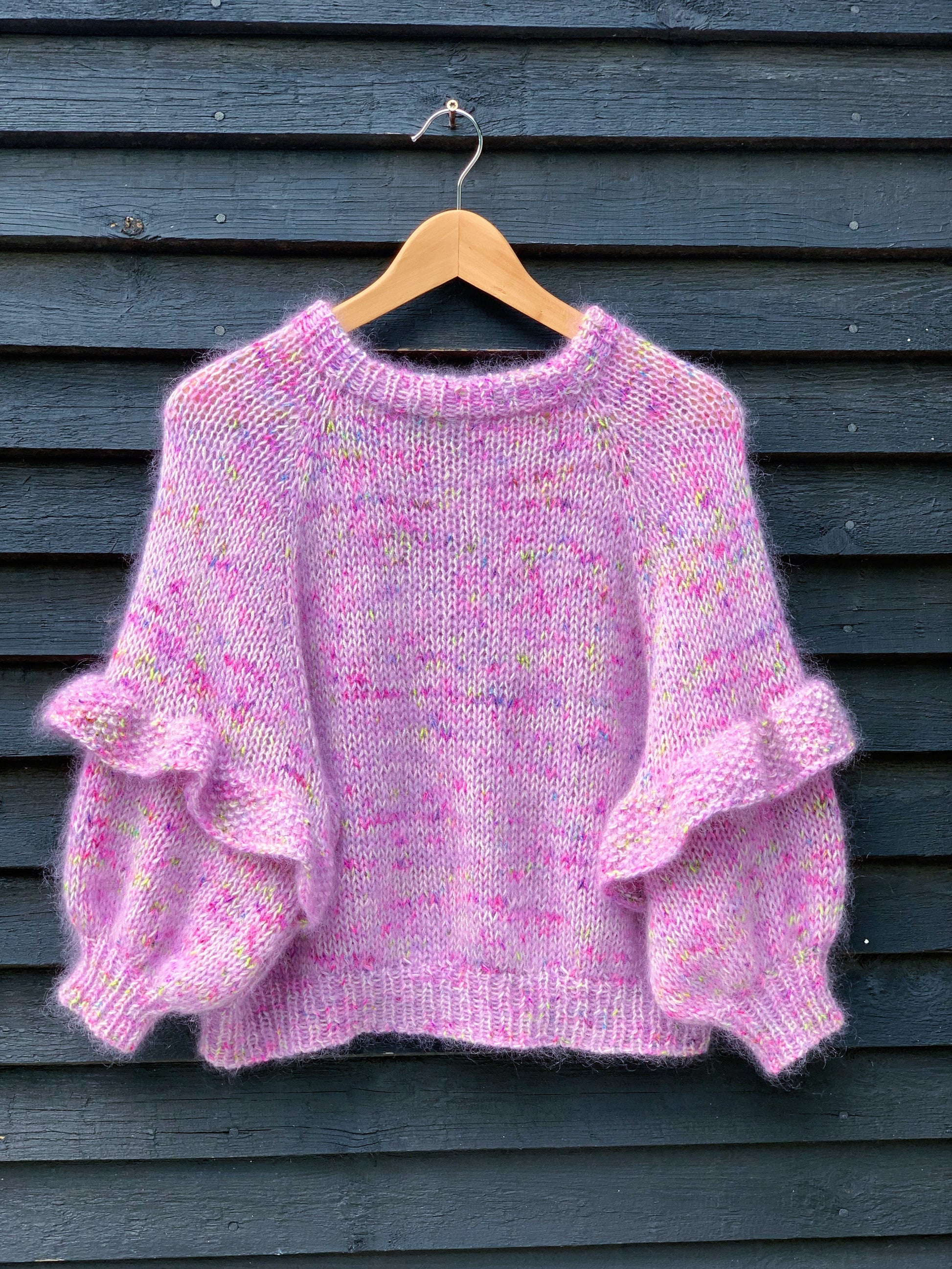 Marshmallow Sweater is a fluffy, oversize knit with a folded band collar, ¾ sleeves with ruffles in seed stitch. It is worked in the round and from the top down by doing raglan increases. The collar is folded and knit together before you start the increases to avoid seaming in the end. Once all increases are done, the sleeves are put on hold while the body is finished. The sleeves are put back on the needle and finished one by one. The ruffle is done by picking up stitches along a purl edge on the sleeve and worked in the round.