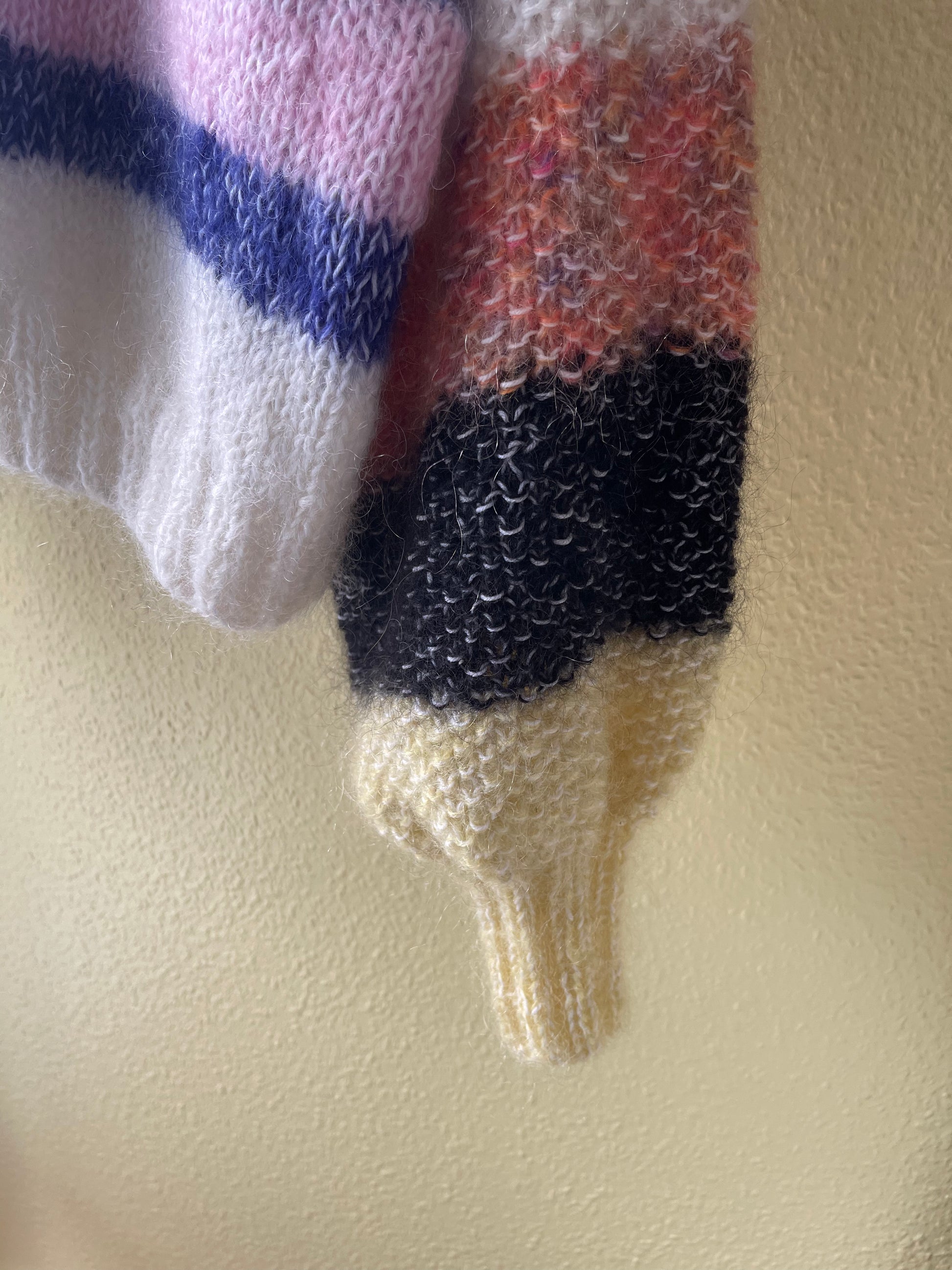 The Pearlypop Cardigan is a cropped model with a stockinette body and seed stitch sleeves. The ribbed edging is knitted in a 2x2 ribbing for a sportier look. It is knitted top-down with classic raglan increases. The yoke and body of the cardigan is knitted back and forth whilst you knit both ribbed edgings in the front in extension of the work. Before that the neck is raised by knitting Short Rows. When all the increases are done the stiches for the sleeves are placed to rest, whilst the rest of the body is knitted. When the body is done the sleeve stiches are placed back on your circular needle and finished separately. If you wish to be able to close your cardigan, you can sew in pushbuttons in the end or sew buttonholes in the finished ribbed edging with the help of buttonhole-stitching.