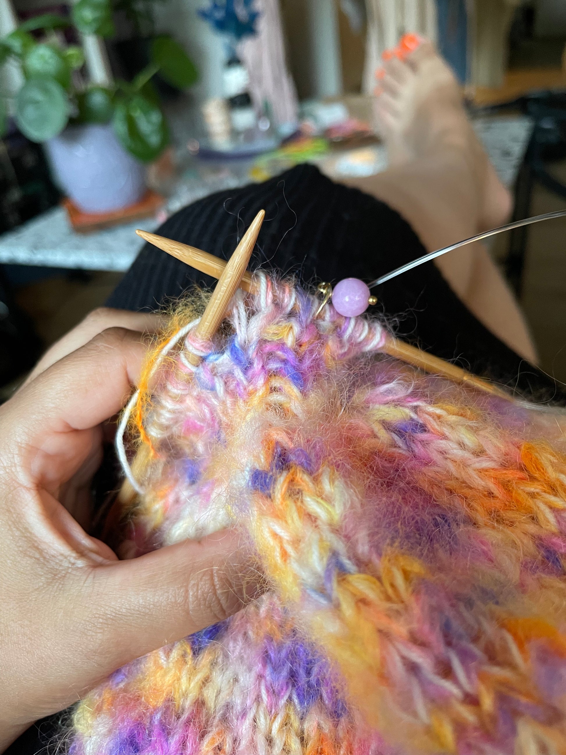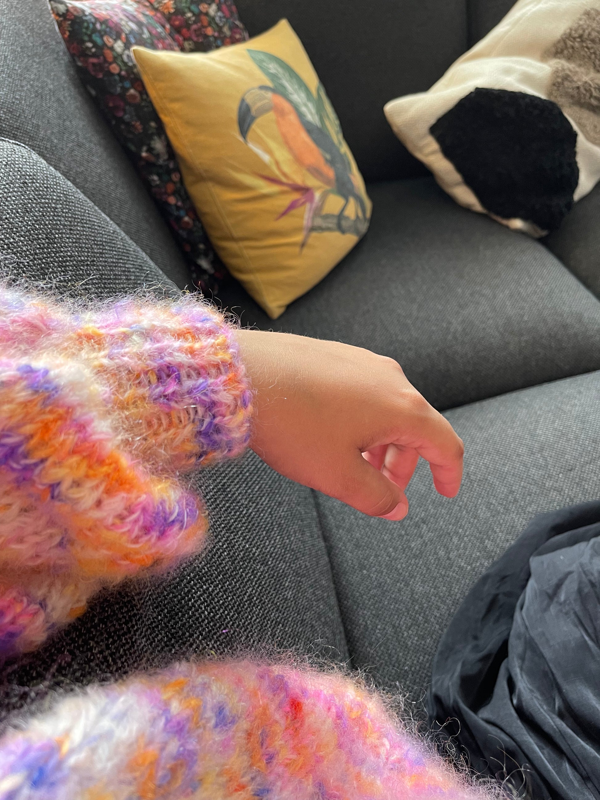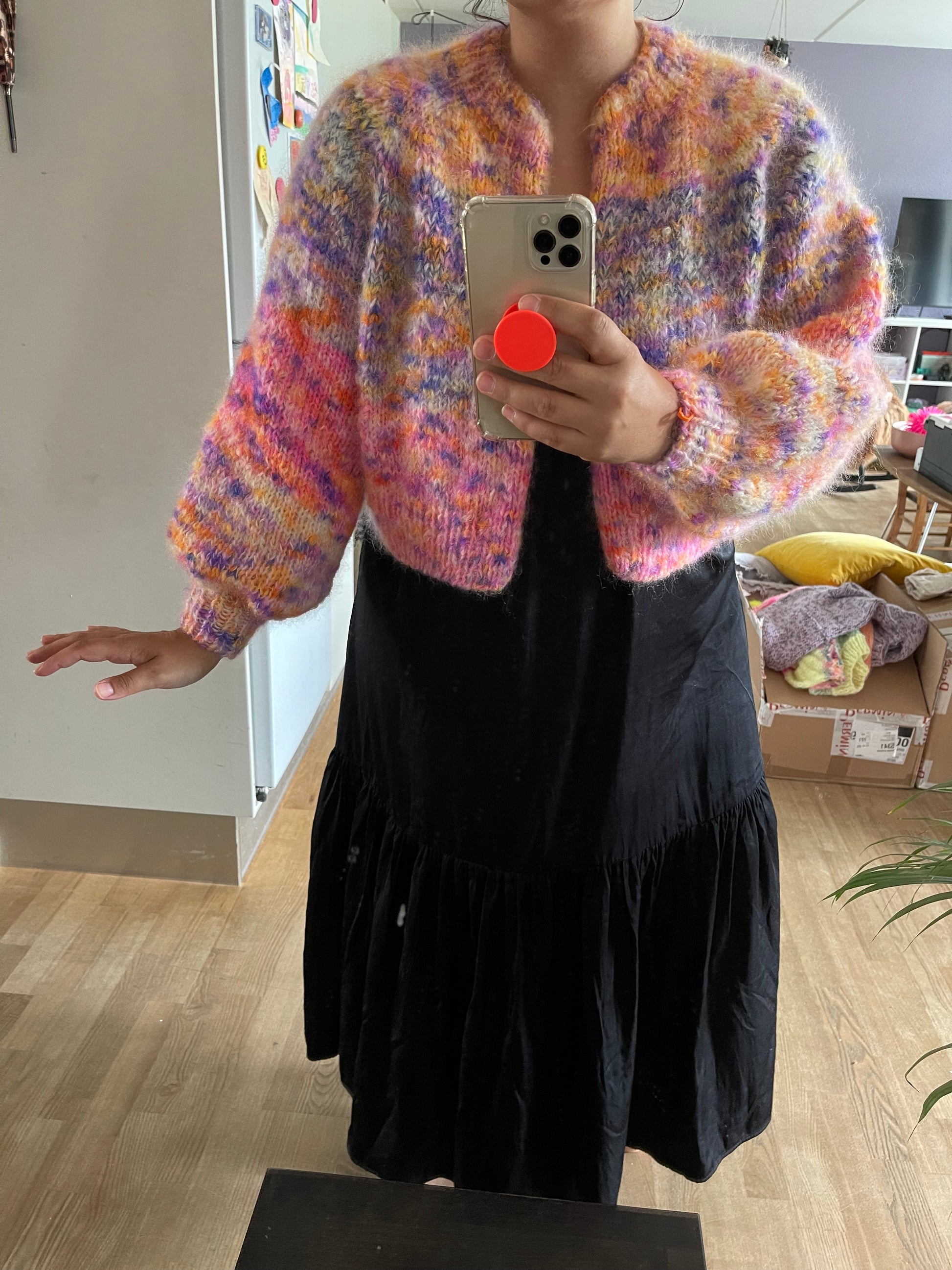 Rainbow Bomber er en lettere oversize og cropped model, som med sin tætte maskebillede snildt kan bruges som overgangsjakke. Den strikkes oppefra og ned ved at lave raglanudtagninger undervejs. Cardiganens bærestykke og krop strikkes frem og tilbage, hvorimod ærmerne strikkes rundt. Jeg har valgt at forhøje nakken for et bedre fit ved hjælp af vendepinde. Jeg bruger teknikken German short rows. Når alle udtagningerne er strikket, sættes ærmemaskerne på hold, imens resten af kroppen strikkes. Når kroppen er færdig, sættes ærmemaskerne tilbage på din rundpind og strikkes færdige hver for sig. Ærmerne strikkes som nævnt rundt i glatstrik, og kan selvfølgelig strikkes med og uden striber. Kanten langs siderne foran strikkes i ret, og du kan senere vælge om du vil sætte en lynlås eller knapper i.