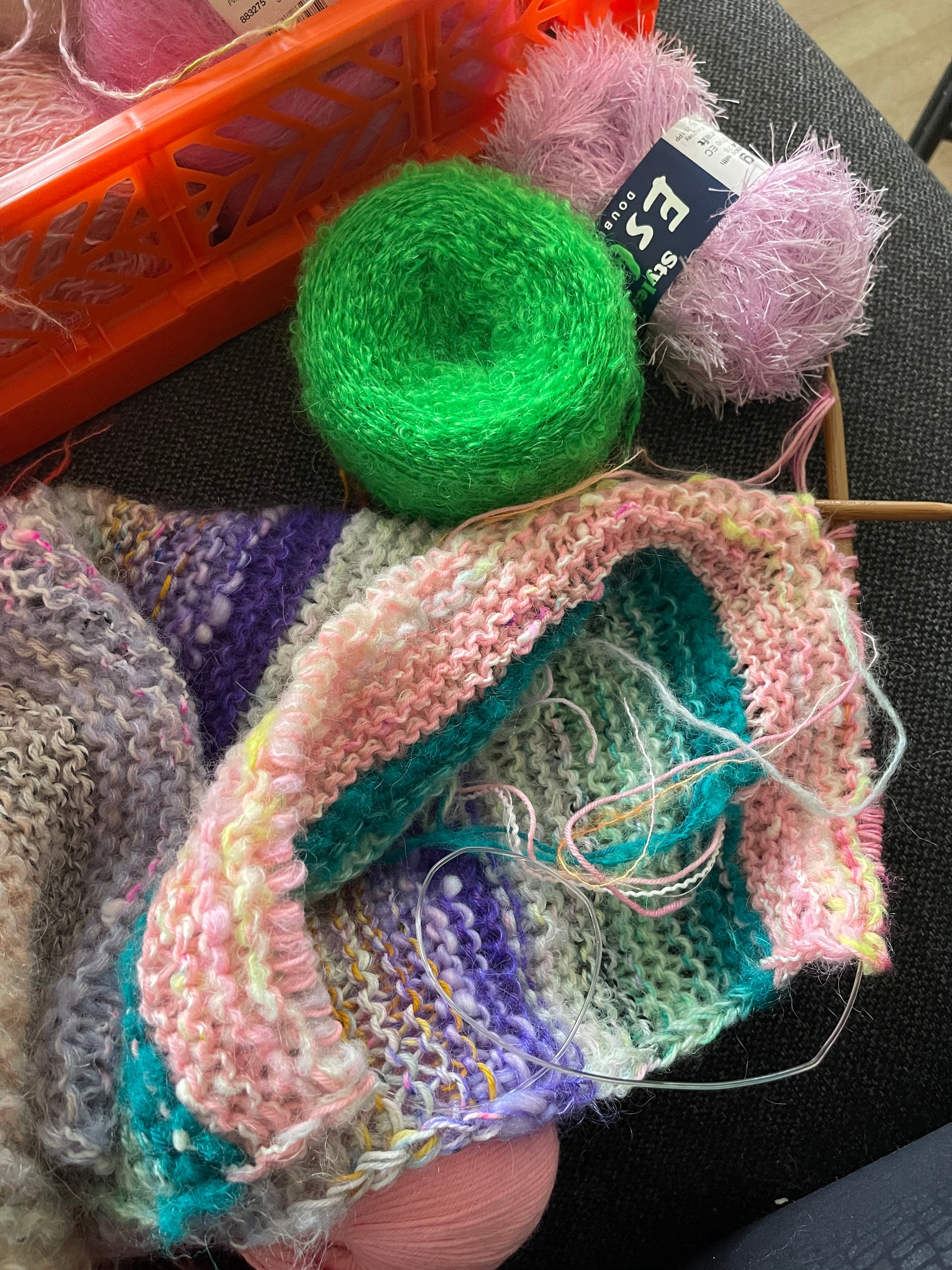 Garntype: Det er jo meningen du skal strikke med dine garnrester, og det handler derfor om at prøve at finde alle mulige slags kvaliteter og sætte dem sammen på kryds og tværs. Et tip kan dog være at de garntyper der typisk strikkes på p 3-5 strikker du 2 tråde sammen. Eksempelvis mohair og merino af den ene eller den anden type. De lidt mere chunky garn typer som strikkes på p 6-9 strikkes alene. Du bruger den samme pinde str. hele vejen igennem, så alt efter hvordan du sætter garnet sammen, vil maskebilledet se forskelligt ud. Altså noget mere luftigt end andet.