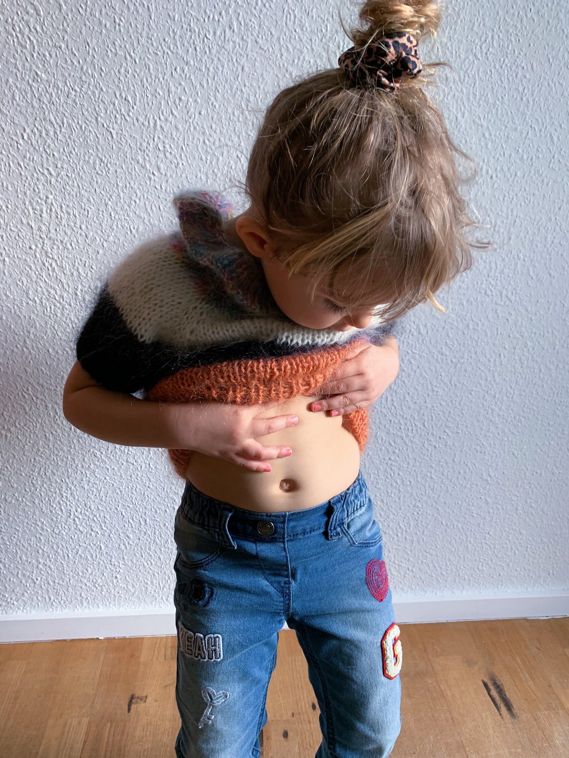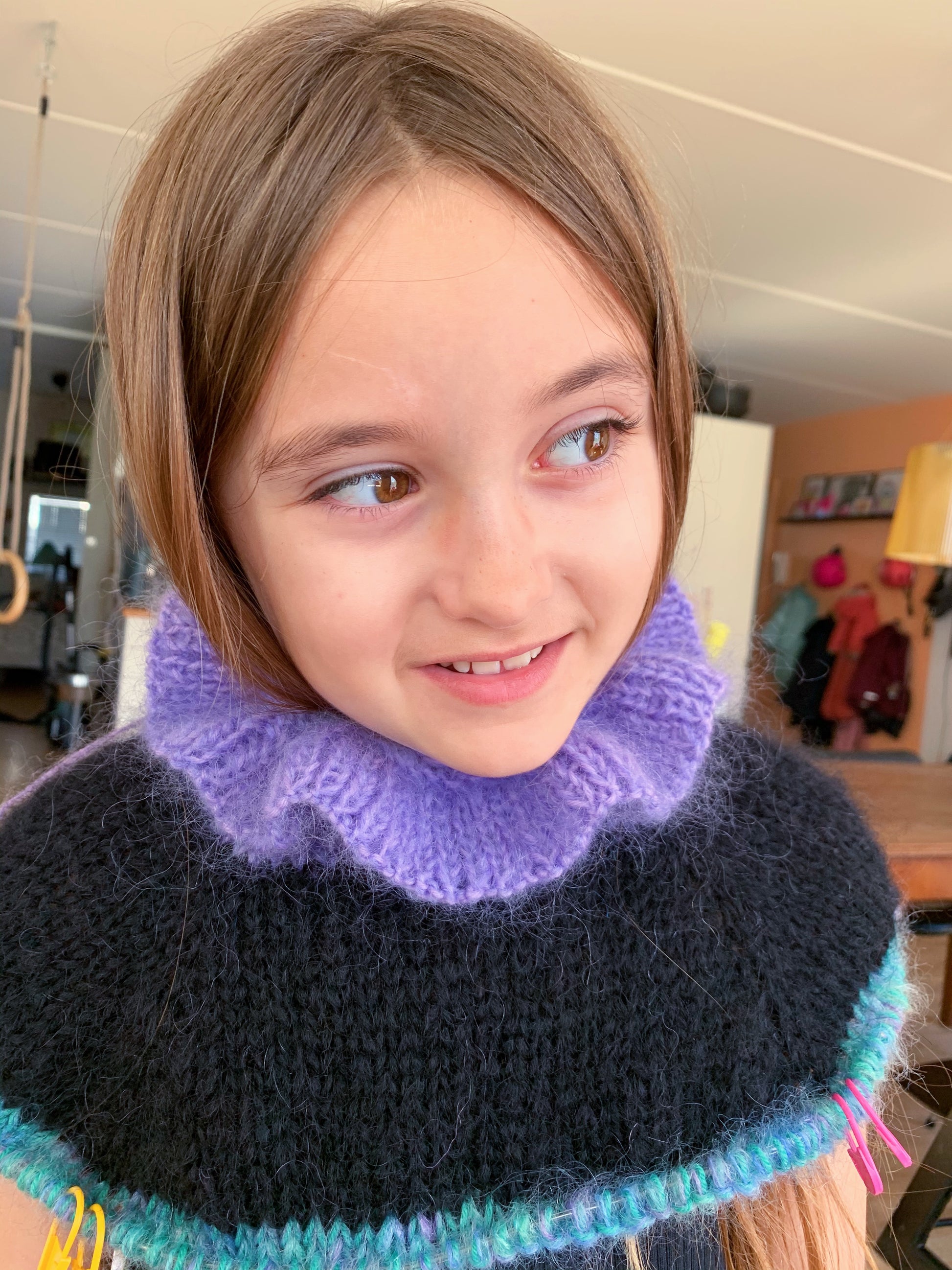Scrunchie Sweater Junior er en blød og chunky strik med fine finurlige detaljer som flæsekrave, ballonærmer og lange ribmanchetter. Den kan både strikkes med korte og lange ærmer. Den strikkes oppefra og ned ud i et, og er helt monteringsfri. Du starter med at slå masker op til flæsekraven, og når den har den rette længde tager du masker ind over to omgange. På den måde får du den rynkede flæseeffekt. Når flæsekraven er færdig, skal du til at strikke rundt i glatstrik, samtidig med at du tager ud omkring dine skulder/raglan masker. Når alle udtagningerne er strikket, sættes ærmerne på hold, imens resten af kroppen strikkes færdig. Til slut sættes ærmemaskerne tilbage på en rundpind, og strikkes færdige hver for sig. Du kan med fordel sætte en elastik i kraven til sidst for at holde på faconen.