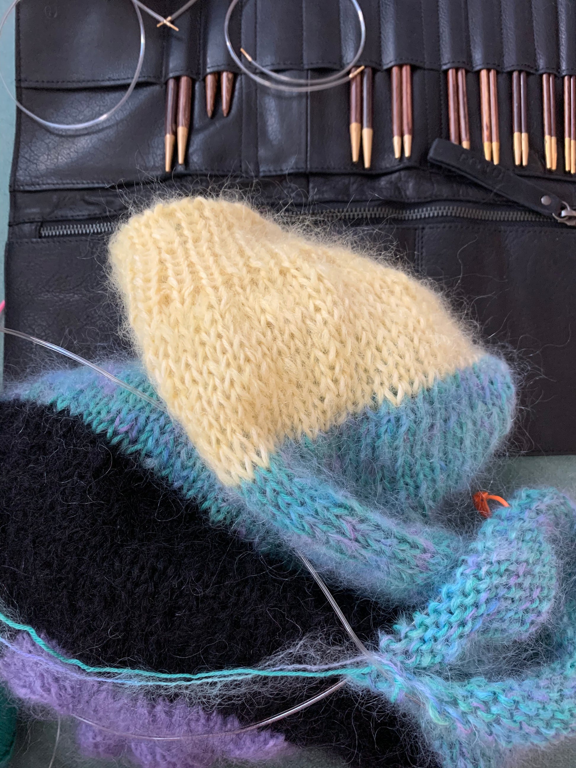 12 masker & 17 pinde = 10 x 10 cm i glatstrik på pind 8 mm med de 2 tråde holdt sammen