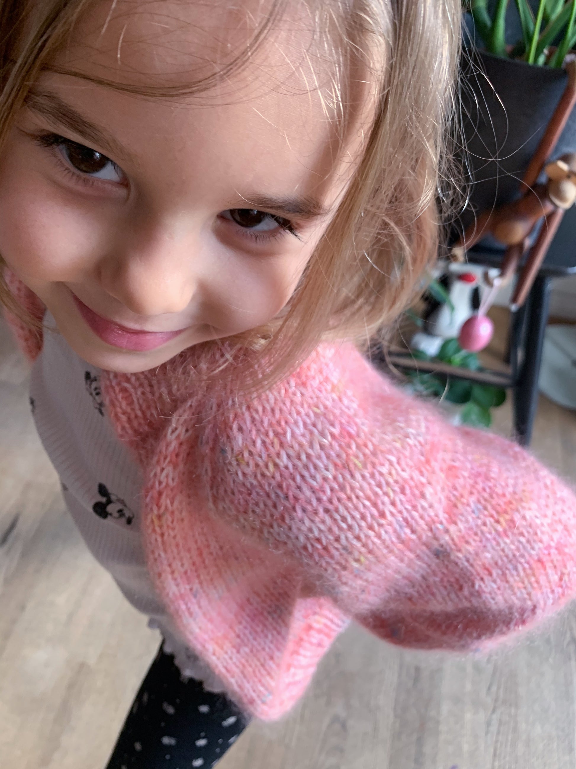 Softpuff Cardigan Junior, er en cropped model, med fine puffærmer. Den strikkes oppefra og ned ved at lave raglanudtagninger undervejs. Cardiganens bærestykke og krop strikkes frem og tilbage, hvorimod ærmerne strikkes rundt. Jeg har valgt at forhøje nakken for et bedre fit ved hjælp af vendepinde. Jeg bruger teknikken German short rows. Puffen omkring ærmerne dannes ved at strikke ekstra udtagninger henover skuldrenes masker i starten af arbejdet. Når alle udtagningerne er strikket, sættes ærmemaskerne på hold, imens resten af kroppen strikkes. Når kroppen er færdig, sættes ærmemaskerne tilbage på din rundpind og strikkes færdige hver for sig. Ærmerne strikkes som nævnt rundt i glatstrik. Ribkanten langs kanten foran strikkes samtidig med kroppen. Cardiganen er ikke ment til at skulle knappes, men bare stå åben. Ønsker du dog, at den skal knappes, kan du med fordel sætte trykknapper i til sidst eller sy knaphuller i den færdige ribkant ved hjælp af knaphulssting.