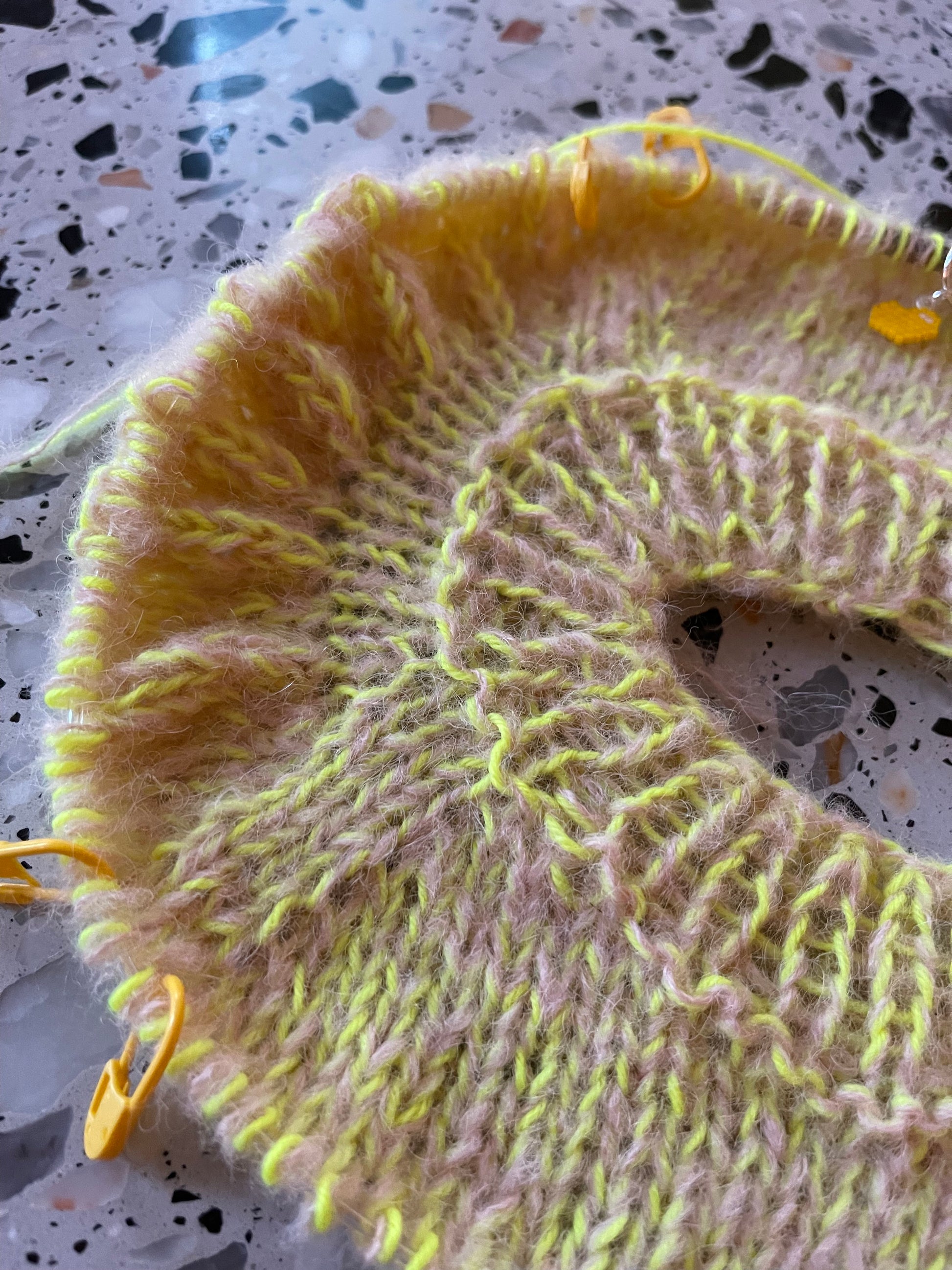 17 masker & 26 pinde = 10 x 10 cm i glatstrik på pind 5 mm med de 2 tråde holdt sammen