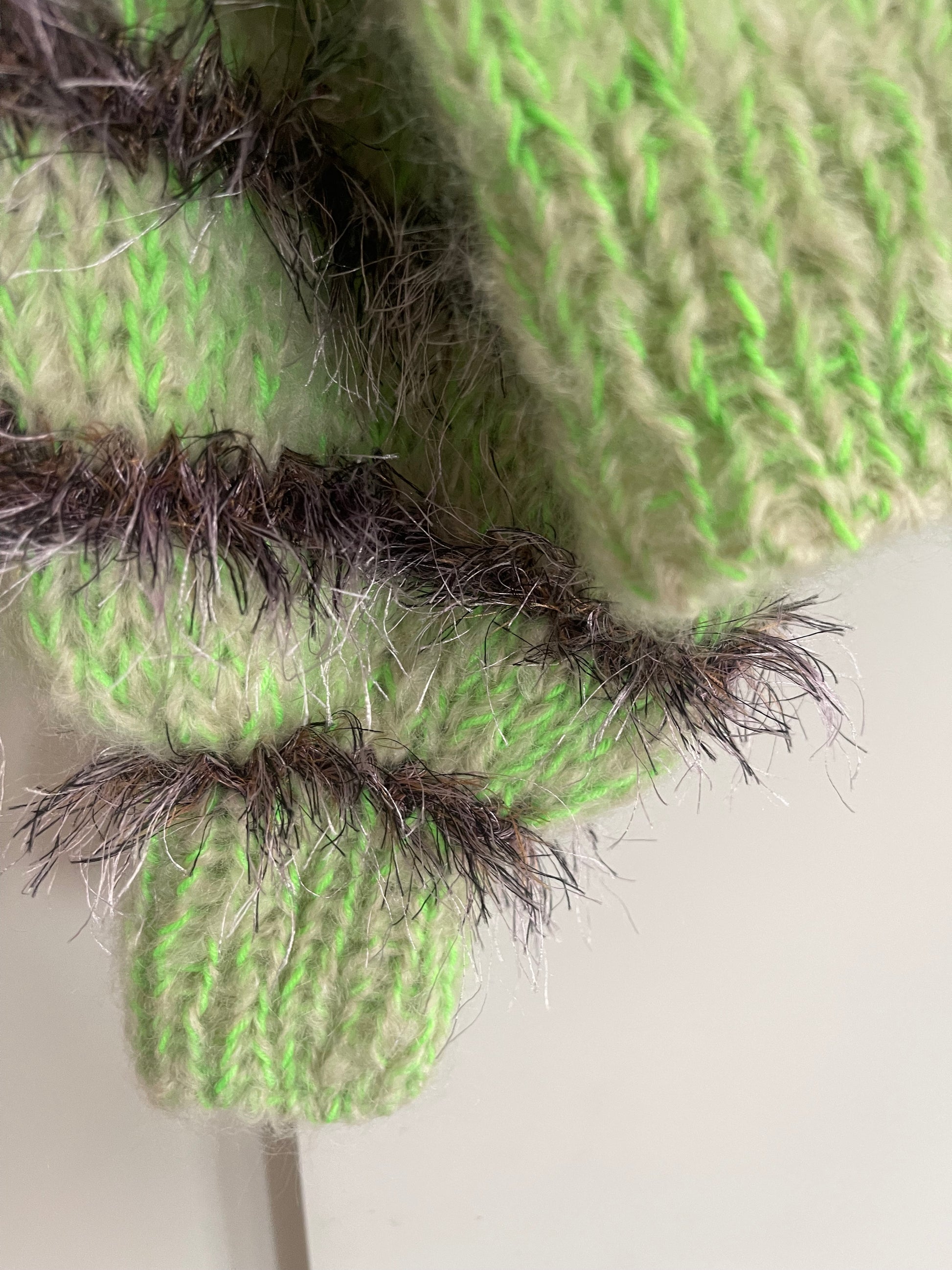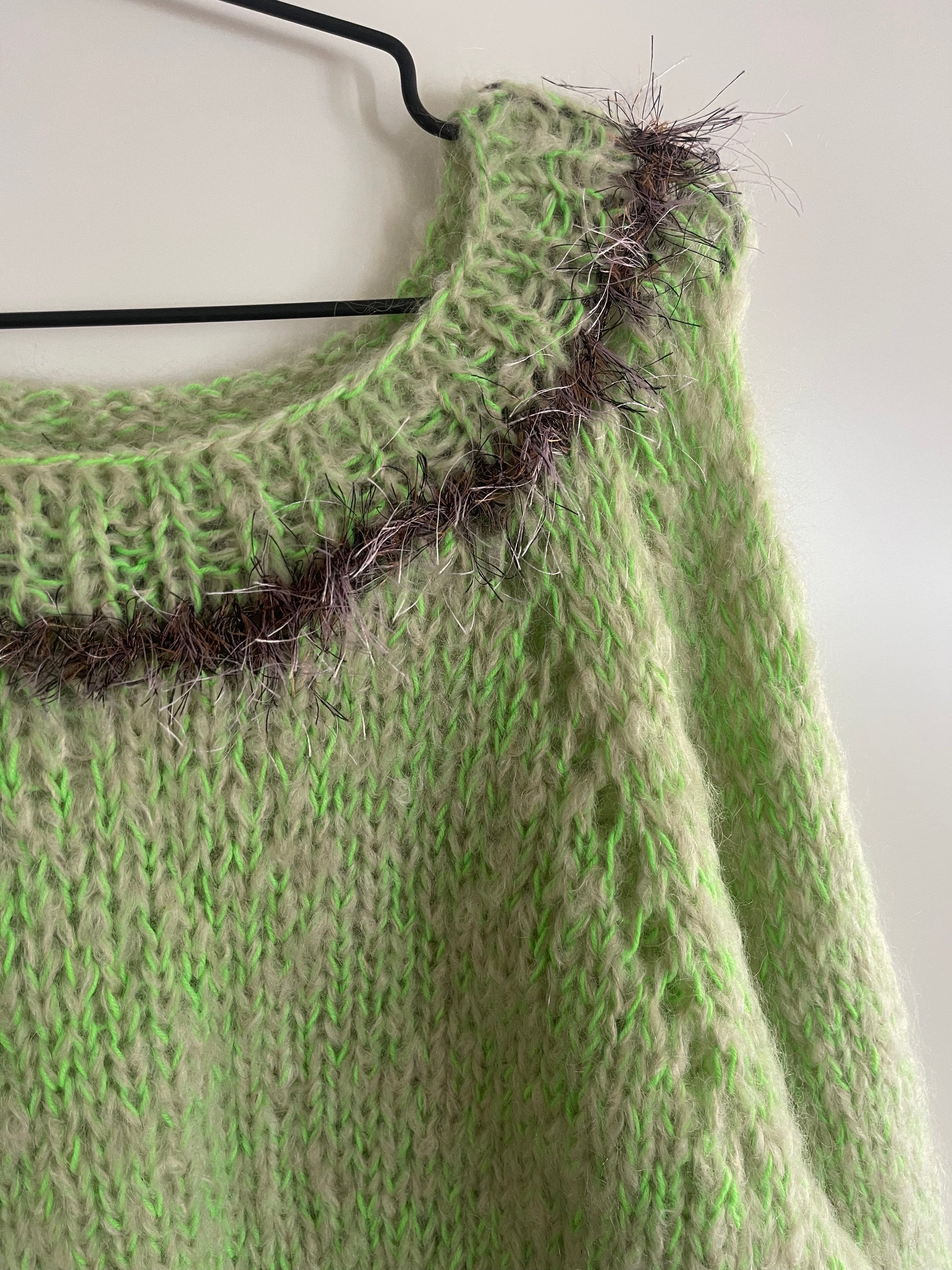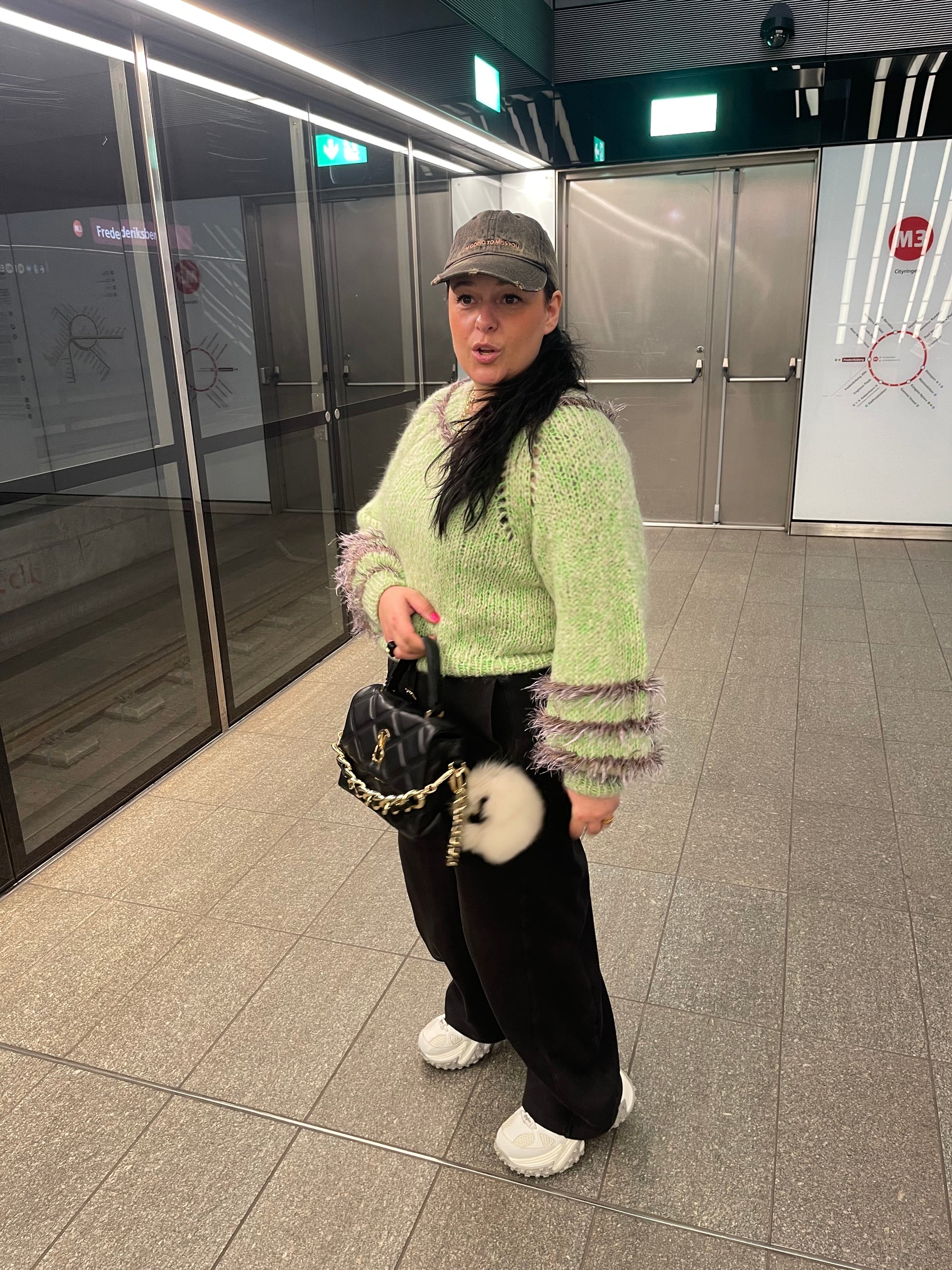 Spicy fur sweater er en rigtig 90´er inspireret model. Den er lettere oversize, cropped, fuzzy og blød og med fake fur detaljer på kraven og ærmer. Den strikkes oppefra og ned med vendepinde i nakken, for et bedre fit. Der bruges German Short rows. Der bruges omslag omkring raglan maskerne, hvilket er en fin og dekorativ form for udtagninger. Ligeledes er pelsgarnet dekorativt, og kan tilføjes lige der hvor man har lyst til. Den kan selvfølgelig strikkes længere hvis dette ønskes, dog skal man bruge mere garn.