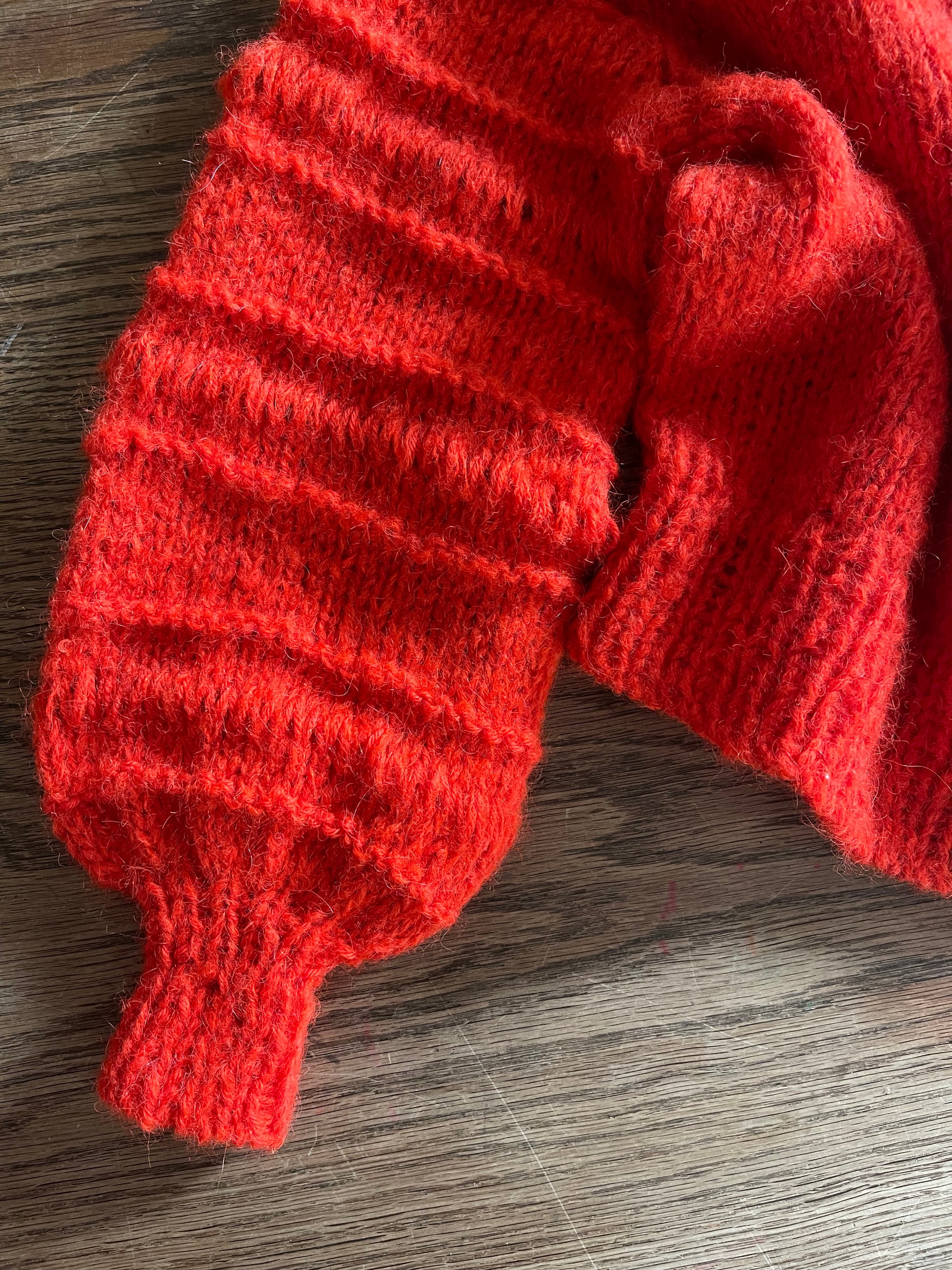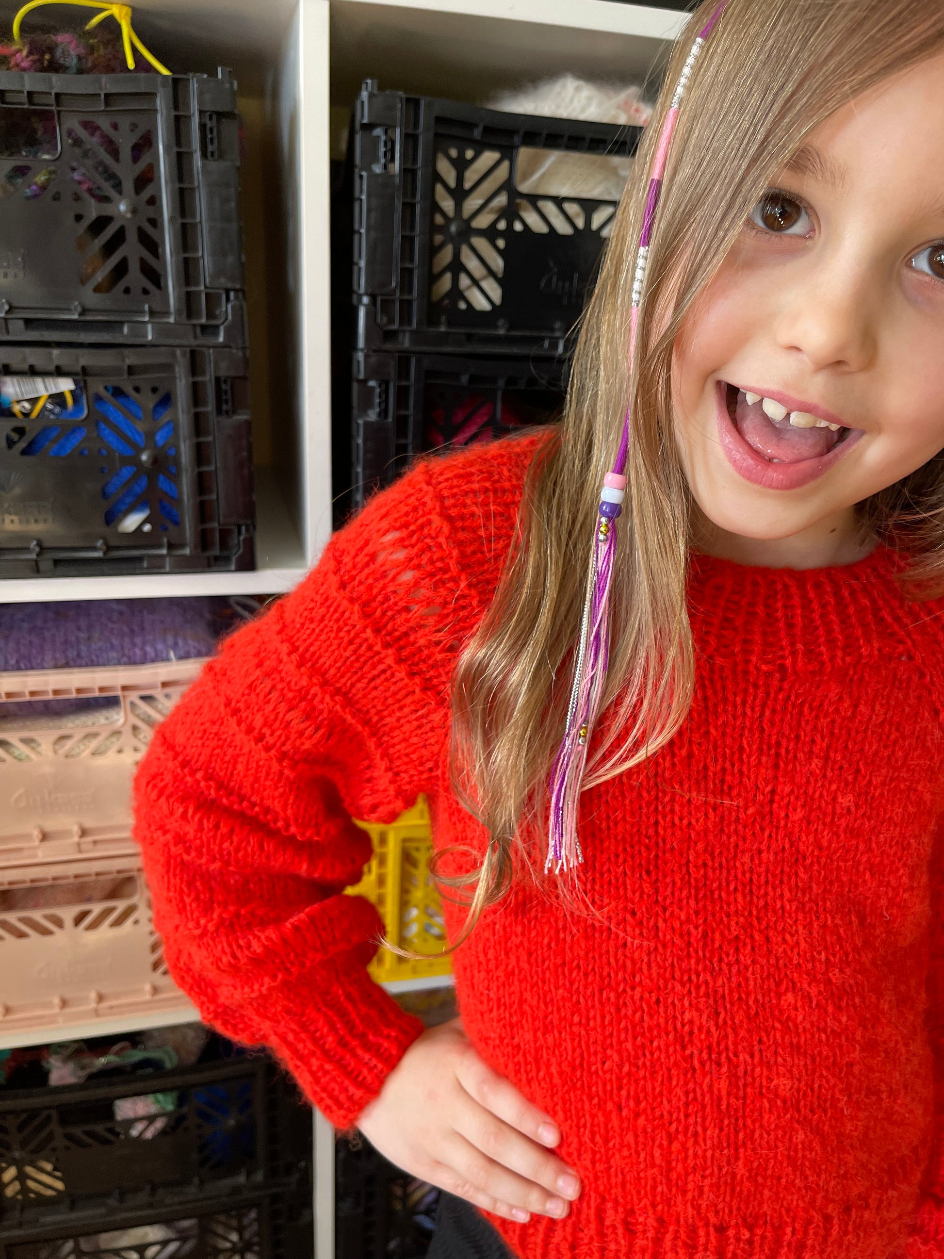 The cropped one sweater Junior er en som navnet indikerer en cropped og slim model med høj hals og fine mønstersekvenser på ærmerne. Den kan selvfølgelig strikkes længere, hvis man ikke er til det cropped look. Den strikkes nemlig oppefra og ned, og kan forlænges efter behov. Der strikkes vendepinde i starten af arbejdet, så den får et bedre fit i nakken. Sekvenserne på ærmerne består udelukkende af ret, vrang og lange masker. Alle teknikker der er brugt i opskriften er beskrevet herunder, og der er ligeledes videolinks til de fleste af dem.