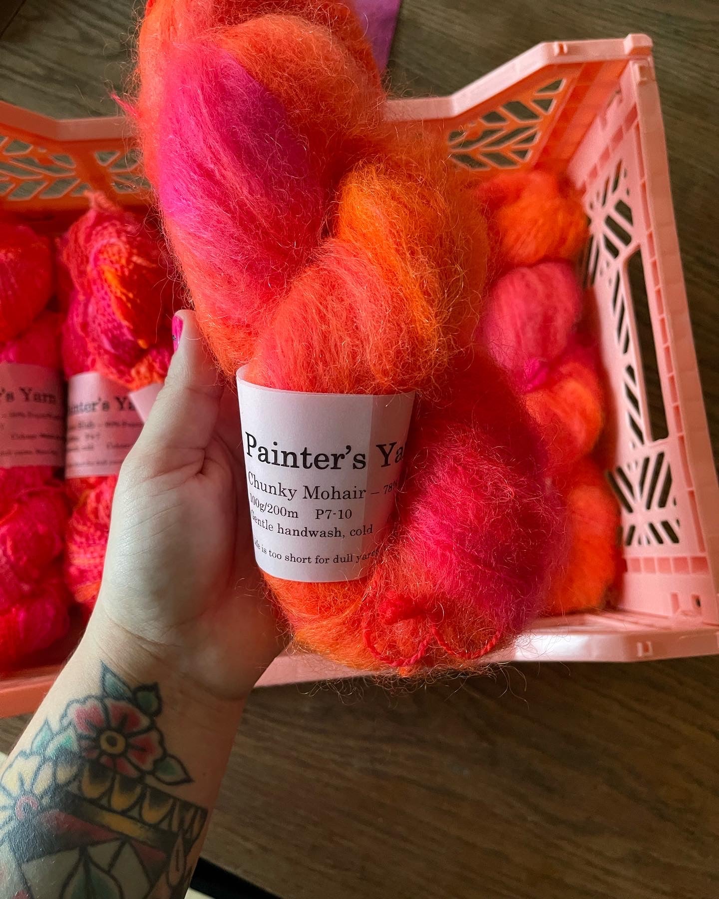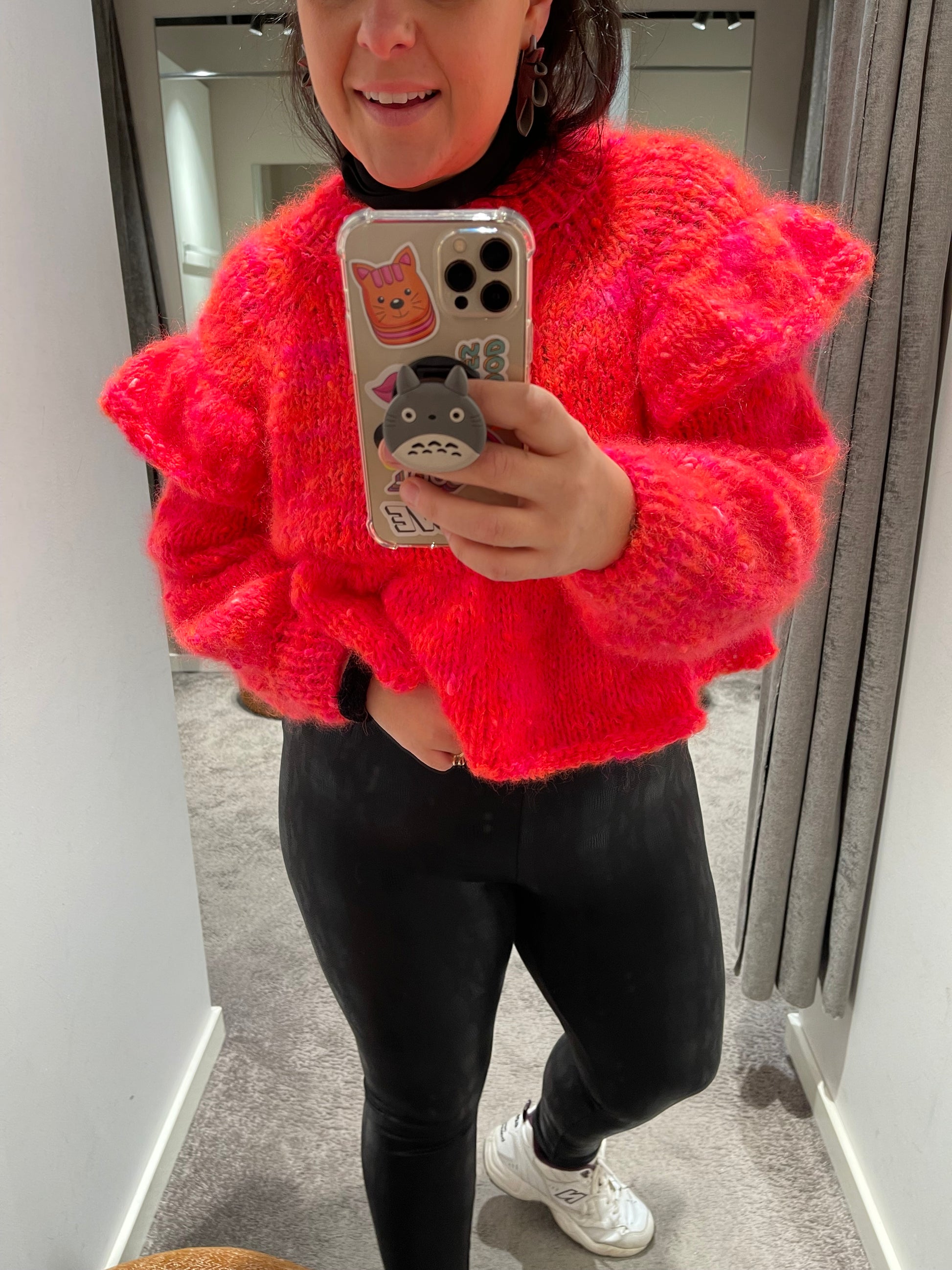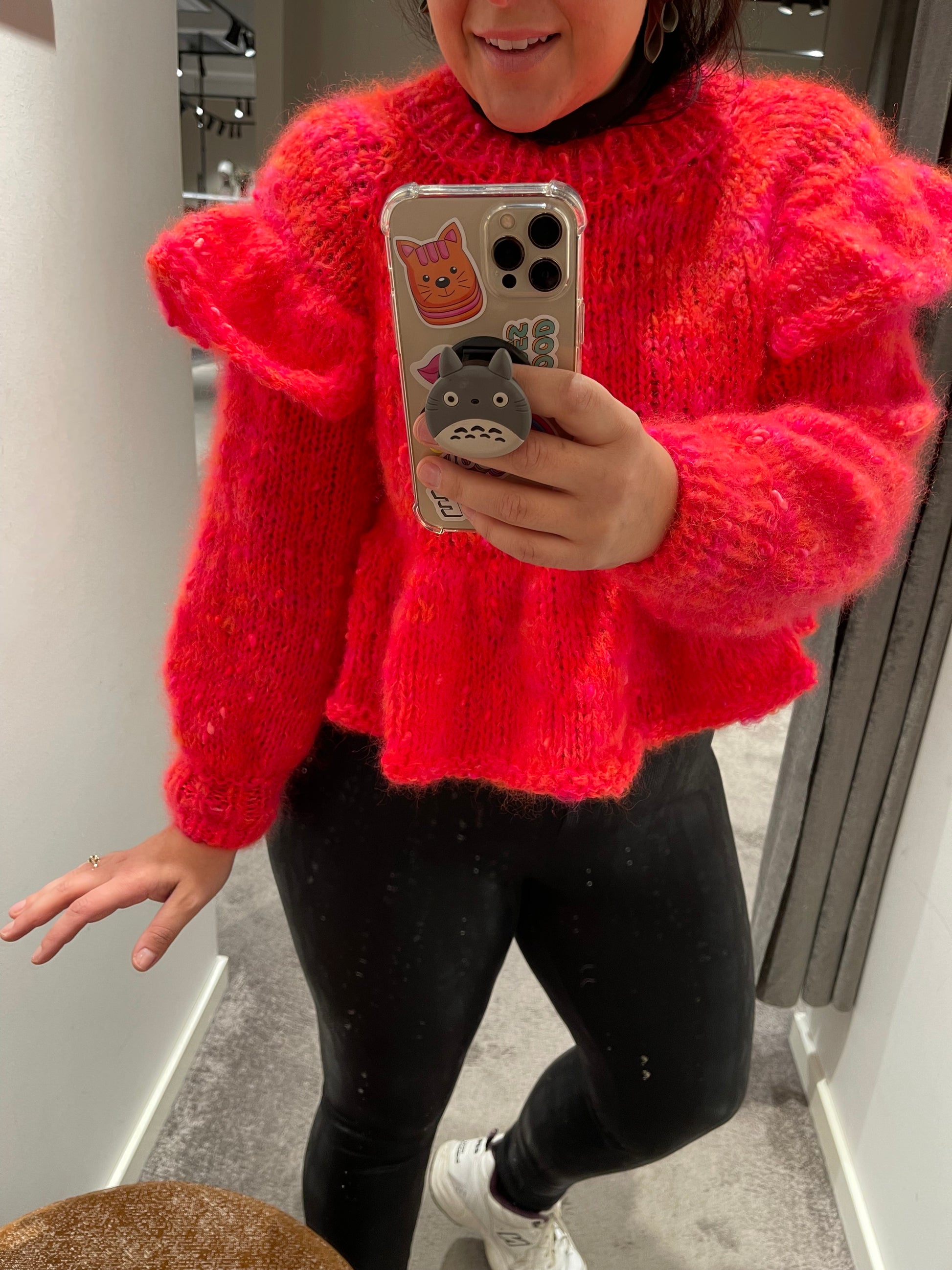 Is a statement piece, no matter what color you knit it in. Despite a slightly oversized fit, it is still super feminine, with the fluttering skirt, frills and the wonderful combination of chunky mohair and slubyarn. It is knitted from top to bottom, and with classic raglan openings on the bodice. At the beginning of the work, double crochets are knitted at the same time, which raise the neck for a better fit. When you have knitted your increases, the sleeves are put on hold, while the rest of the bodice is completed. Then stitches are picked up for the skirt, which is knitted in the round in stockinette stitch. The sleeves are put back on a circular needle, and when these are finished you can finally knit your ruffles. The model is not difficult, and on the big sticks it goes fast.